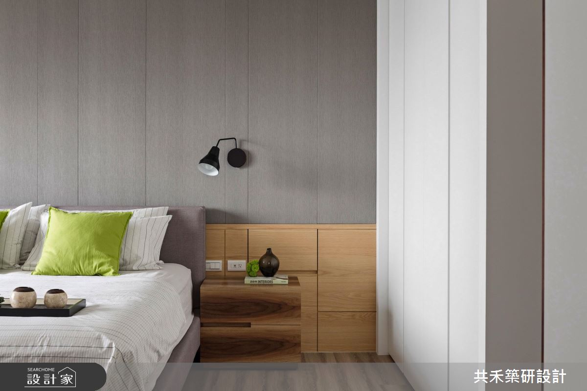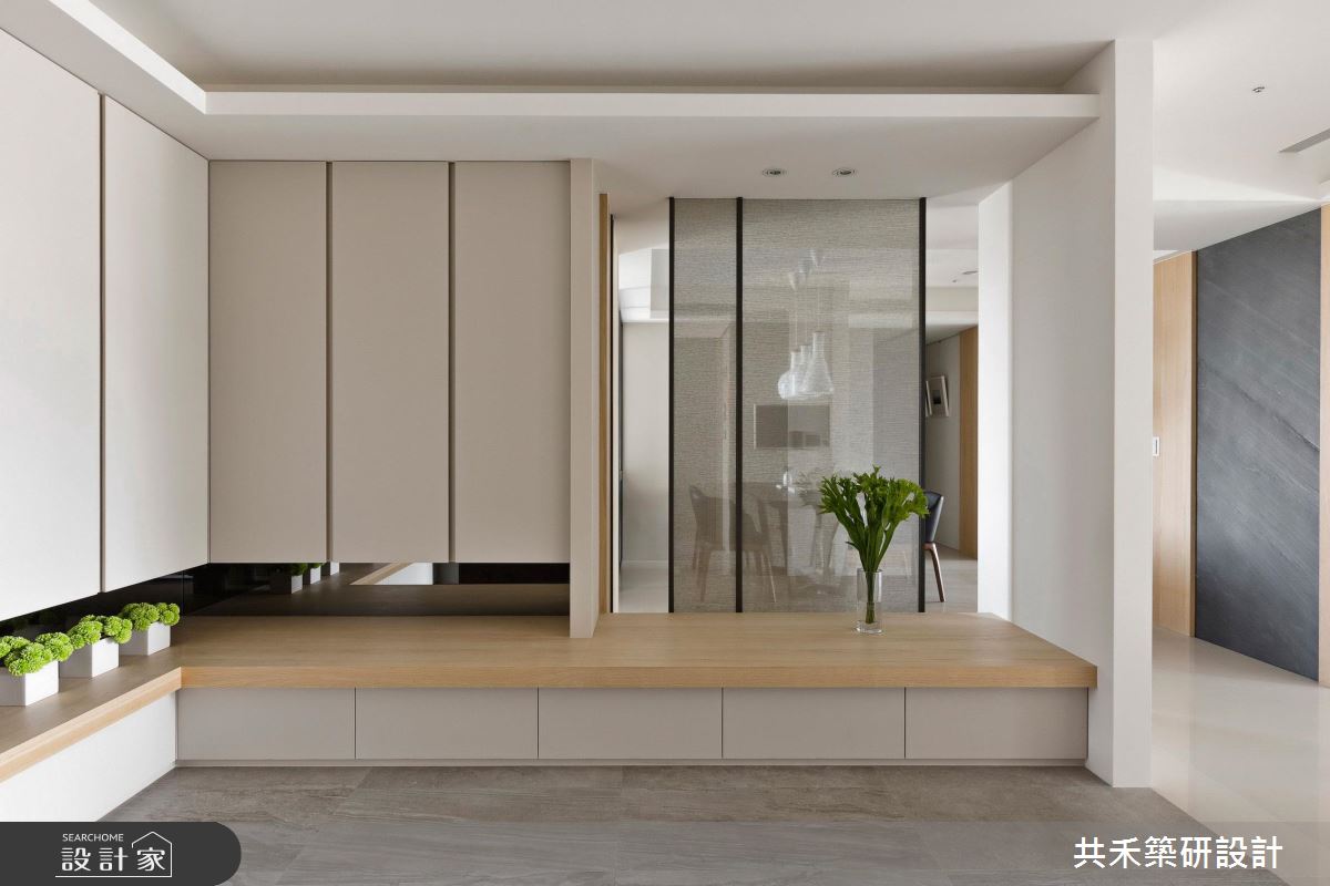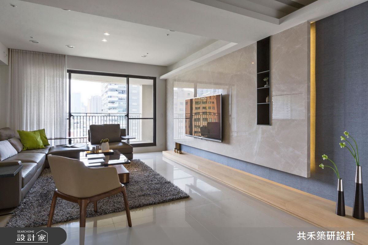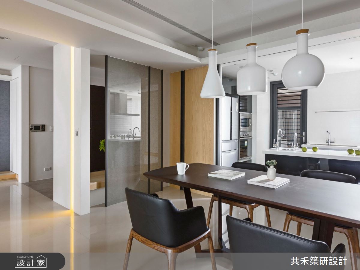 旋開大門,迎向開闊的玄關領域,輕漾著奶油色調的收納櫃體,搭配淡雅木紋的平台,伴隨綠意植栽的點綴,調和出清爽、有溫度的居家氛圍;大理石鋪陳整體公領域地坪,戶外暖陽穿透網紗窗簾,篩落滿室唯美光暈,替現代風格調出家的暖心基調;丹寧色調的壁面,疊上米色系的大理石牆,展現漸層、充滿張力的電視牆,由右側以黑色層板框構出開放展示區,植入人文設計的巧思;以中央大樑為界,劃分出客廳、書房與餐廚領域,沙發後方透過玻璃隔間,創造閱讀區;餐廚空間也以玻璃推門界定,穿透的視覺特性讓室內更顯開闊,形塑流動感氣息;書房空間裡,藉由落地窗引入充沛光源,木作層板與鐵件交織出展示區,後方壁面則打造整面書牆,虛實相間的櫃體設計,創造出豐富的空間表情。