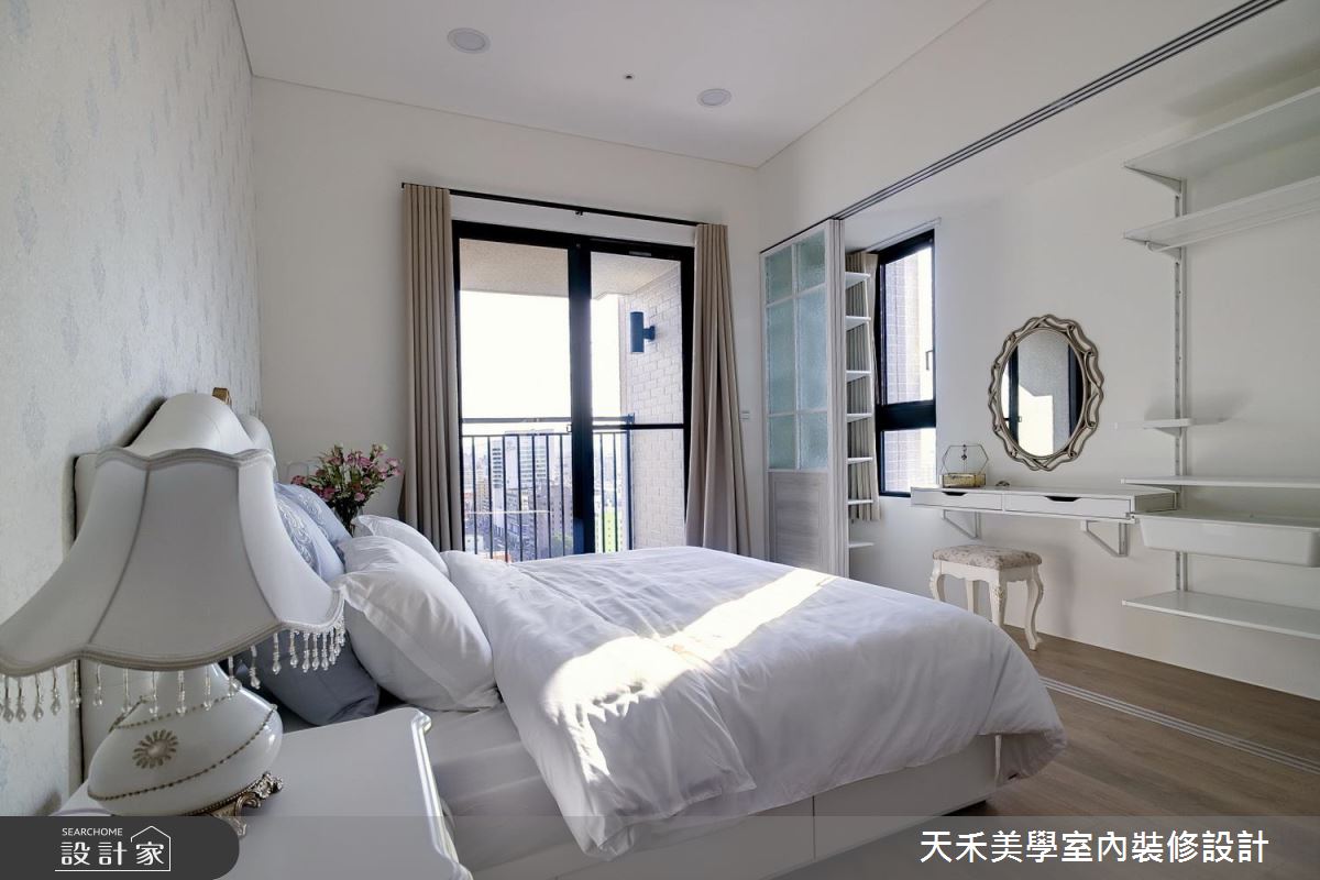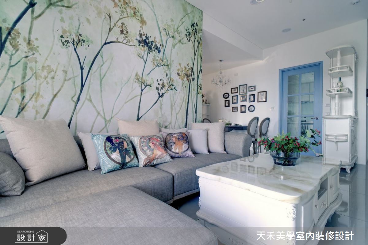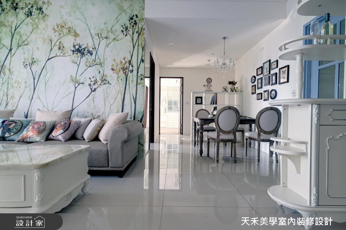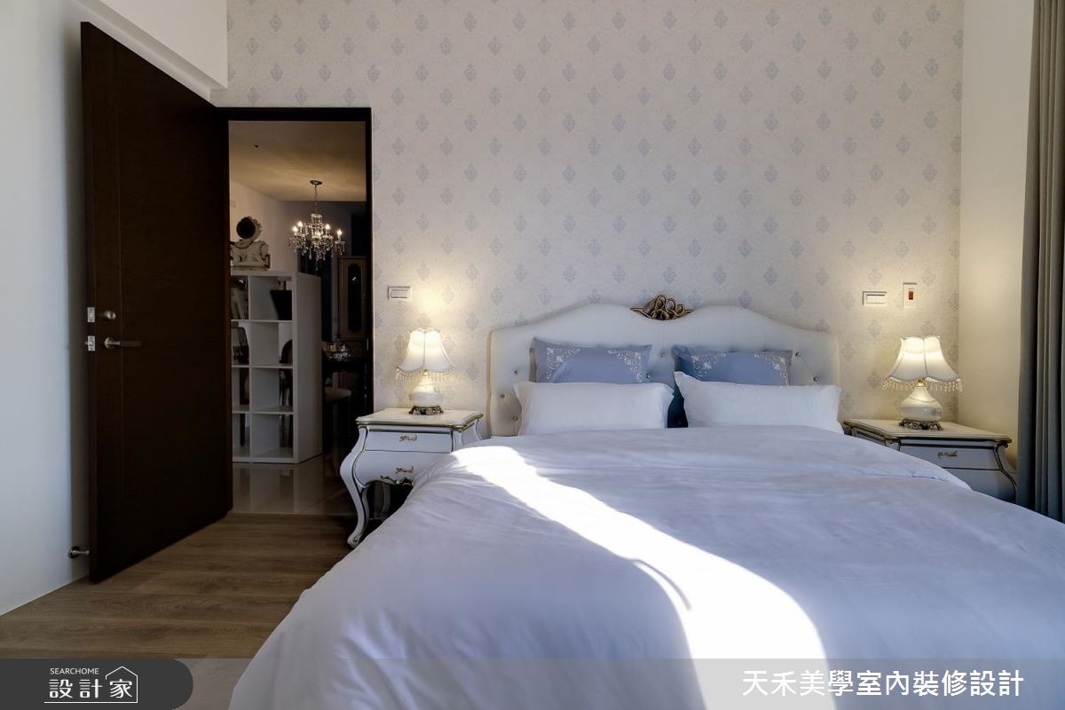 進入 18 坪的新古典風居所,滿溢著簡約清爽,以及典雅精緻的居家質感,為了幫助屋主控制預算,設計師減少了木作訂製數量,運用輕裝修手法,以仿石電視牆搭配精選法式壁紙、家具等,型塑甜美浪漫的風格氛圍,也因女主人喜愛鹿所帶有的靈性,沙發背牆後方貼飾整面森林系壁紙,挹注高雅自然的氣息,也巧妙呼應了屋主夫妻的信仰。主臥室運用訂製鋁框滑門,崁入古典系統門片,區劃出梳妝和更衣空間,減少封閉式櫃體的沉重感,也更能充分利用良好的採光條件,延續空間的明亮感受。