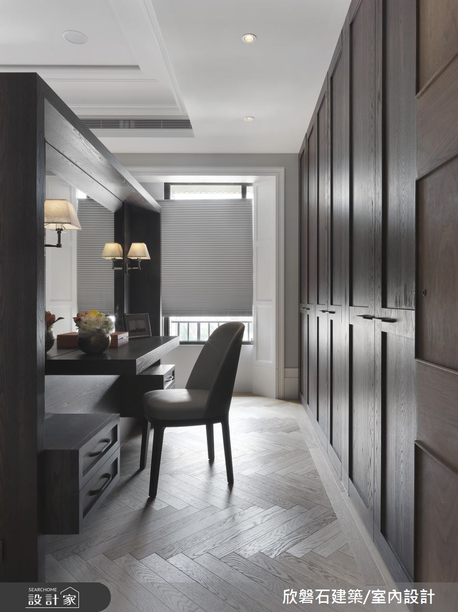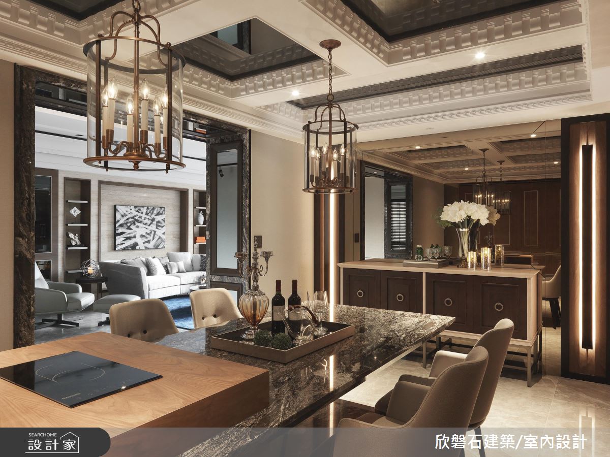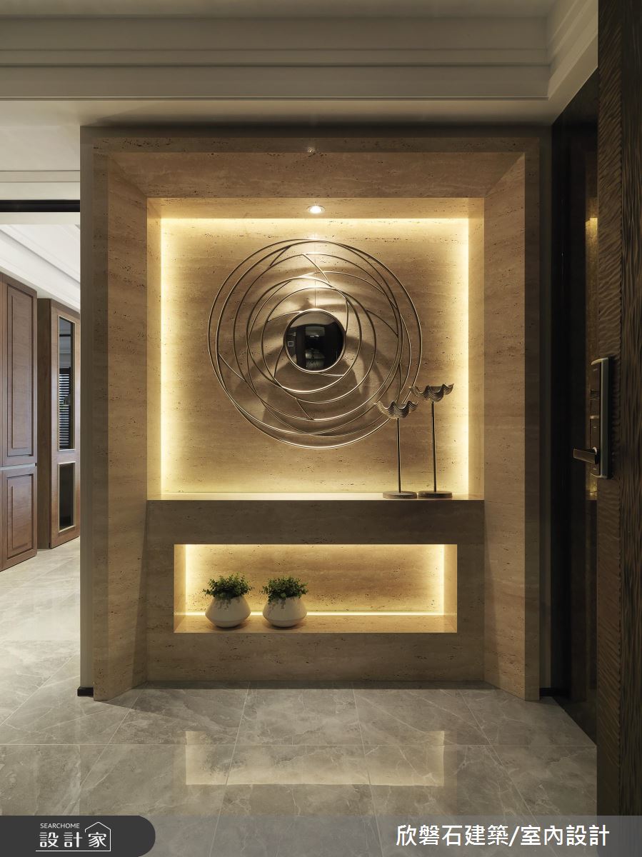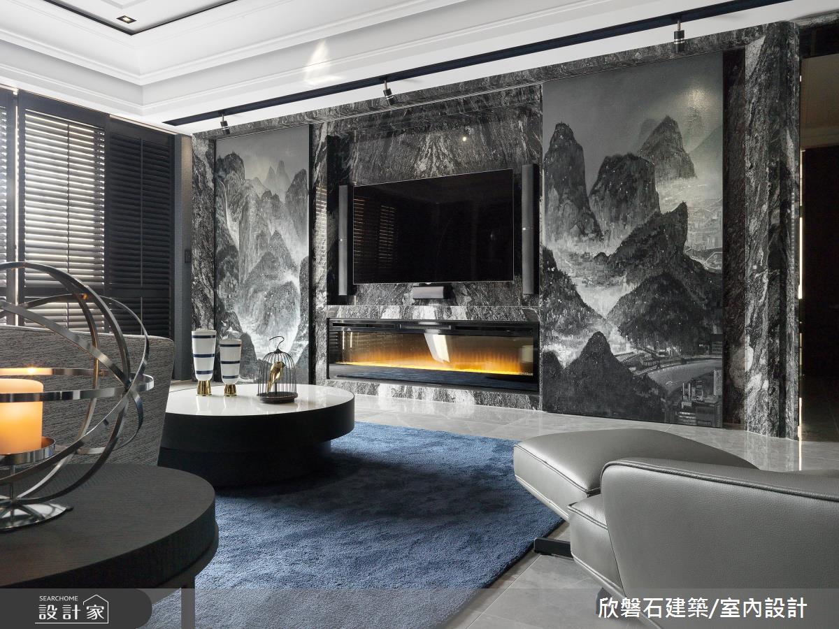 旋開大門,眼前打造一處米色調洞石為基底的端景牆,石材切割出立體造型,搭配嵌燈設計,中央擺設玫瑰造型的裝置藝術,流露出藝術美學。公領域裡,天然石材與木紋相互搭配,展現大器之姿又不失溫潤情誼;客廳裡以灰色調質感的沙發擺設,形塑優雅的人文精采,搭配石材結合手繪潑墨山水畫拉門的電視牆,山巒重疊的壯闊器度替室內挹注一抹東方神韻,拉門的安排也替電視與電子壁爐找到完美藏身之處;相較於沉穩的客廳空間,餐廳轉以溫潤的氛圍呈現,藉由古典的元素遊走在領域之中,天花板以經典線板搭配鏡面設計,堆砌出優雅視感;原木材質的中島銜接石材餐桌,藉由溫暖光源的調和下,烘托出浪漫、愜意的用餐氛圍。