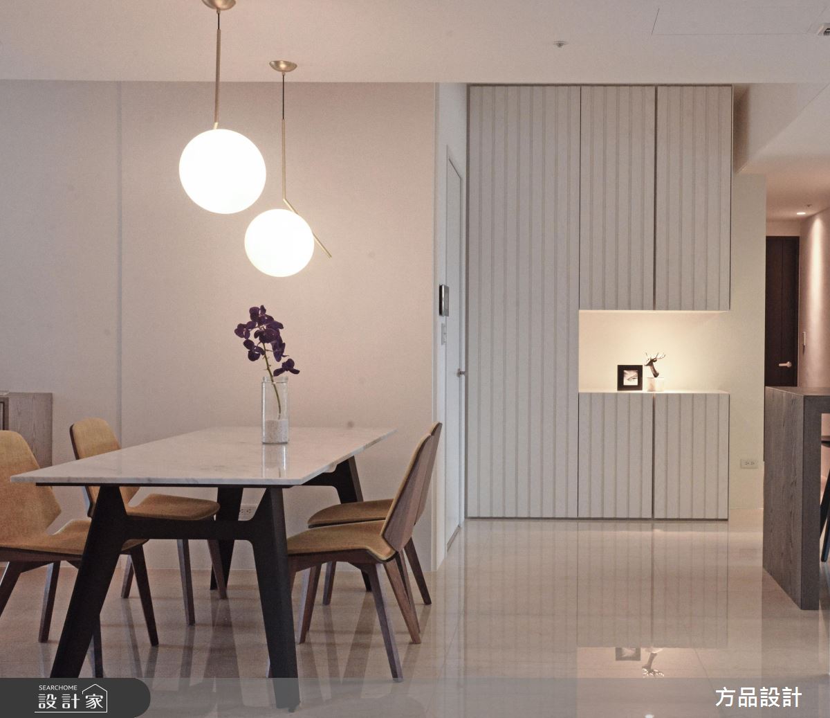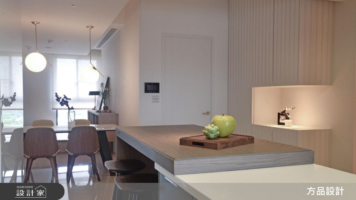 在色彩運用上,設計師引用輕盈的軟件家具,搭配暖色系的光源佈置,讓一切線條柔和且流暢,予人舒服輕鬆的歸屬感,電視牆則採用鐵件、木作等異材質組構,同步匯聚展示與收納的意義,型塑充滿層次感的主牆表情,且運用局部穿透式的概念,化去壁面的厚重封閉感,讓空間與空間之間作出通透且明顯的界定,達成空間感延伸效果;牆面後方的多功能起居室,則賦予巧妙彈性的規劃,不僅可與電視牆共用收納空間,也善用地坪架高的深度配置抽屜,藉以發揮有限坪數的最大效能;餐廚領域則開放延展,除了打造加長的吧檯,網羅更多機能,也讓餐桌陳列位置充滿過渡性質,成為一家人的最佳生活互動場所!