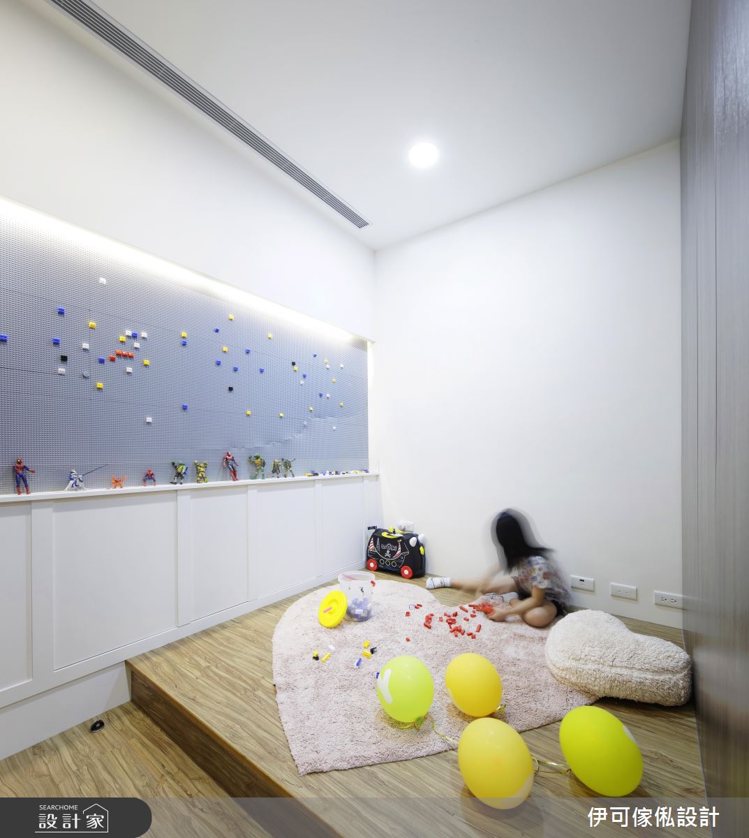 走進小孩房的遊戲室內,可見到獨特的牆面設計,除了將電箱巧妙隱藏外,也加入樂高拼貼板,成為一道機能遊戲牆,讓孩子在遊戲中學習創意思考!