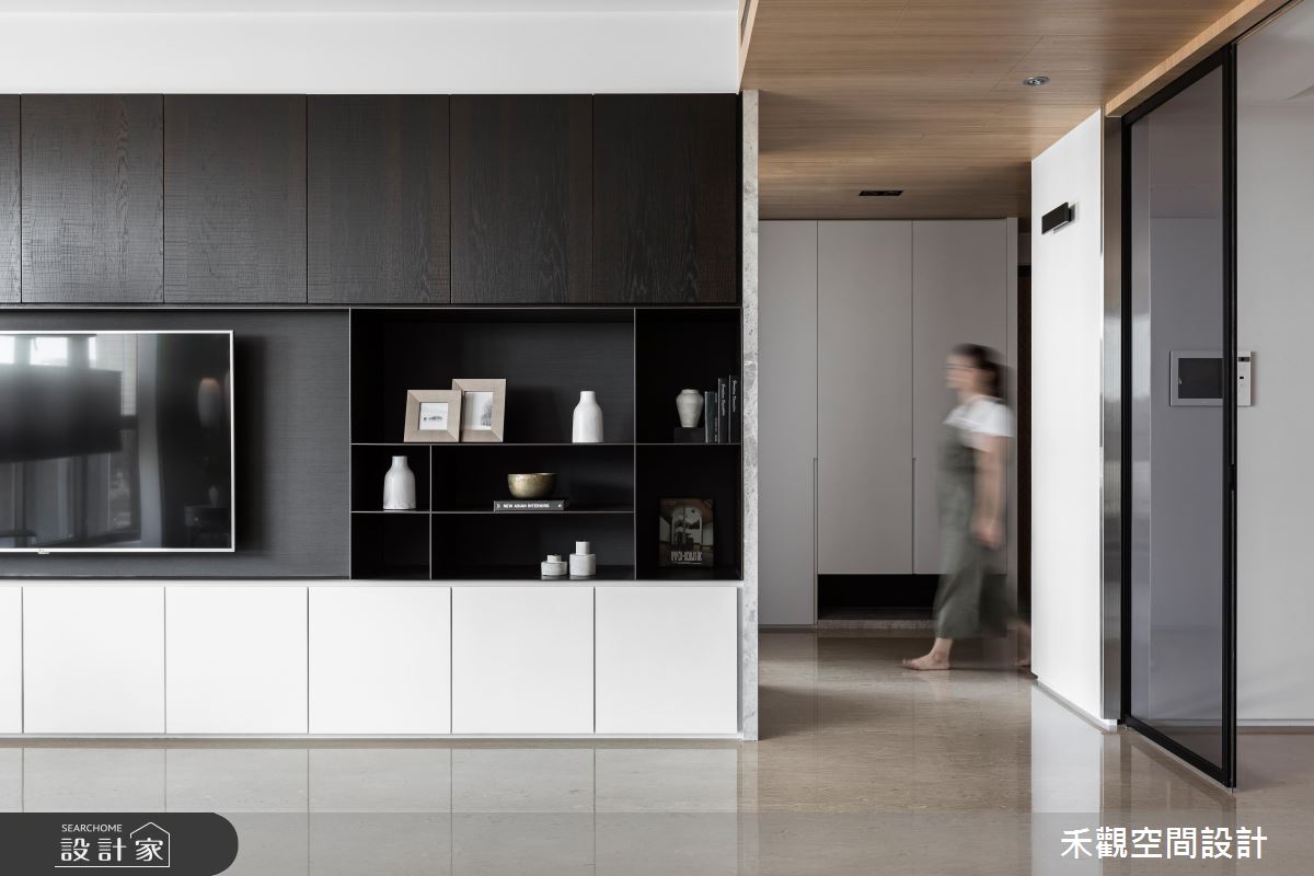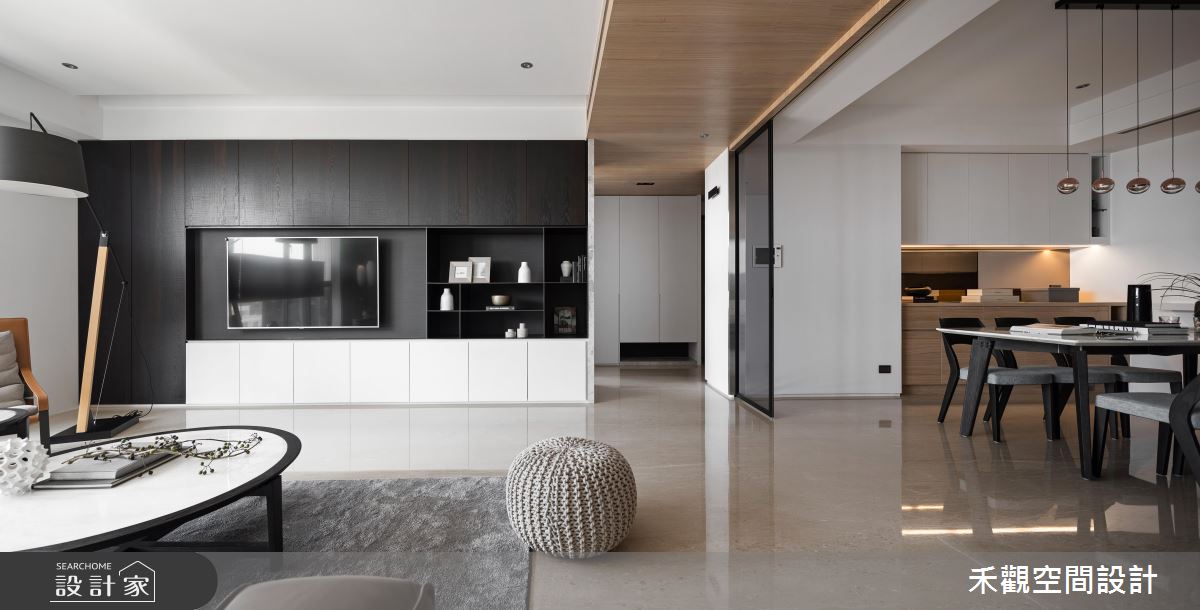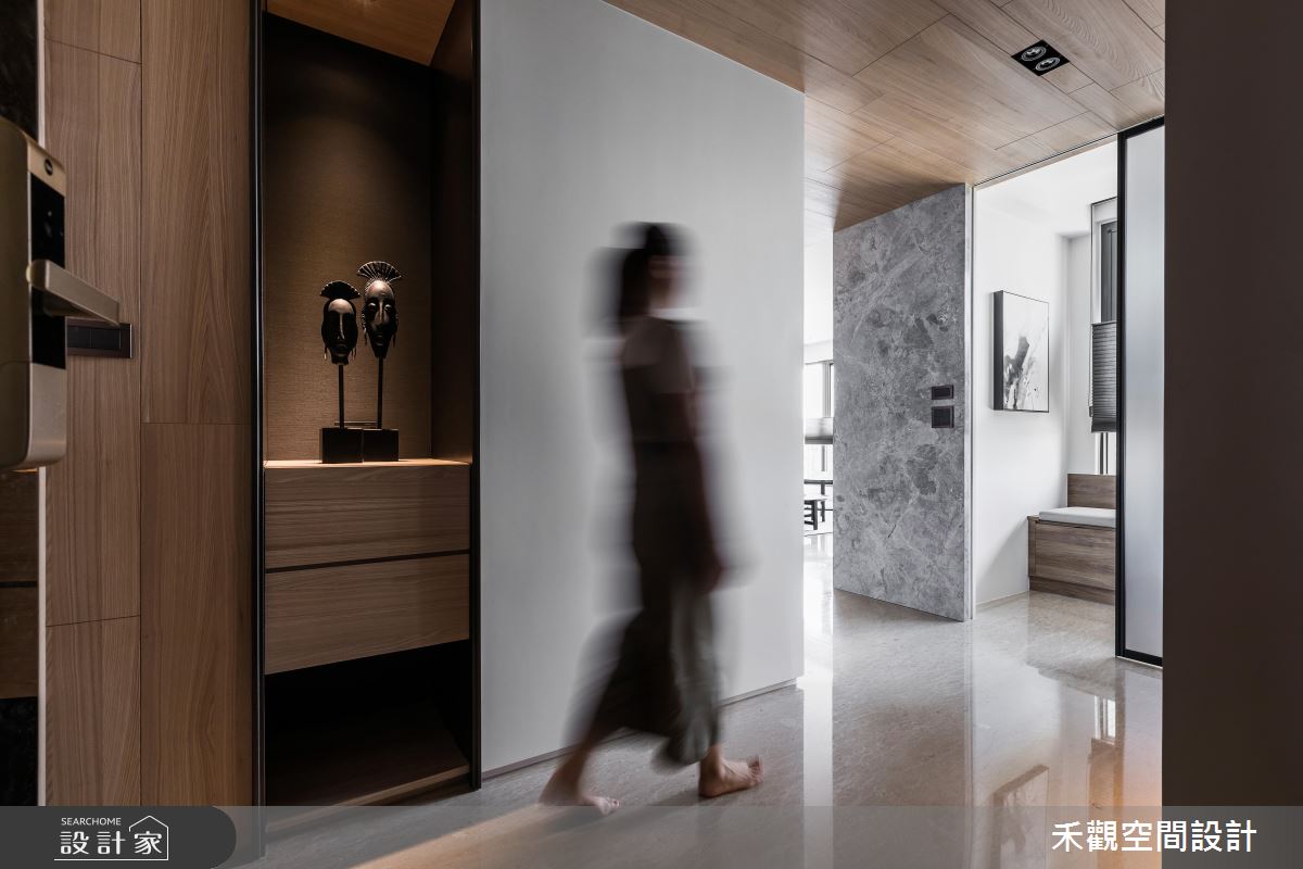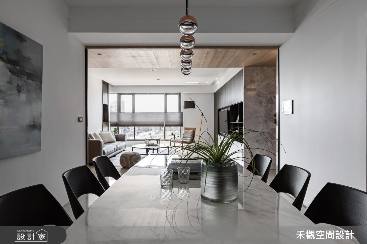 從入口開始以大理石鋪陳地坪,隨著光源的投射,展現明亮、潔淨之意,玄關的兩側更打造收納與展示區,滿足生活實用之需,甚至安排一處衣帽間,方便屋主進出時整頓儀容;玄關到客廳的廊道上,天花板以木紋舖陳,暖色調的自然質感帶來溫潤的空間氛圍;日光隨著落地窗引入客廳,映照出分明的兩側壁面,白色飾底的沙發背牆,烘托藝術畫作之美,對面則以深咖啡色系的原木質感,搭佐白色調櫃體,且融入電視牆的機能,深淺配色的對比手法,彰顯鮮明的家屋風格,加上展示空間的規劃,創造出日常的人文美學;開放式拉門界定出餐廳空間,讓戶外的光線能夠延伸入室,目光隨著懸掛的燈飾,來到戶外窗景,視野隨即遼闊開來,若有烹調需求,可將拉門關上,度絕油煙困擾,也能保有獨立空間供的使用。