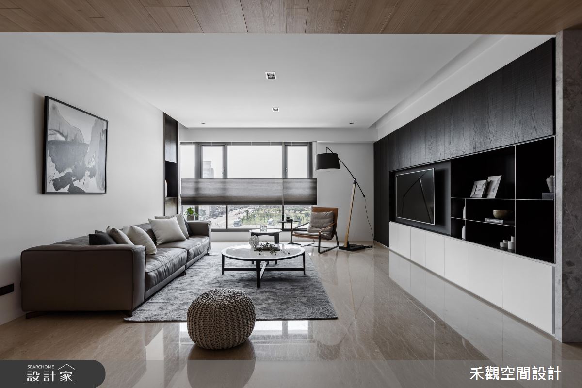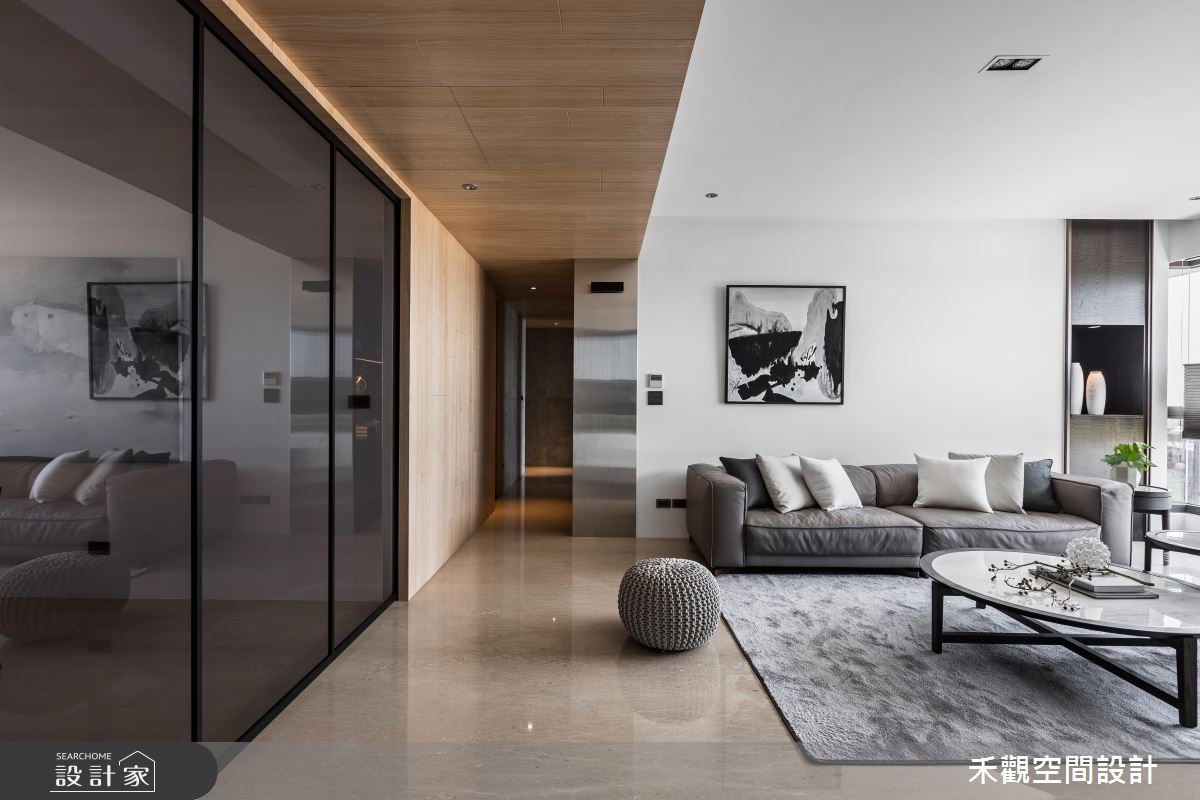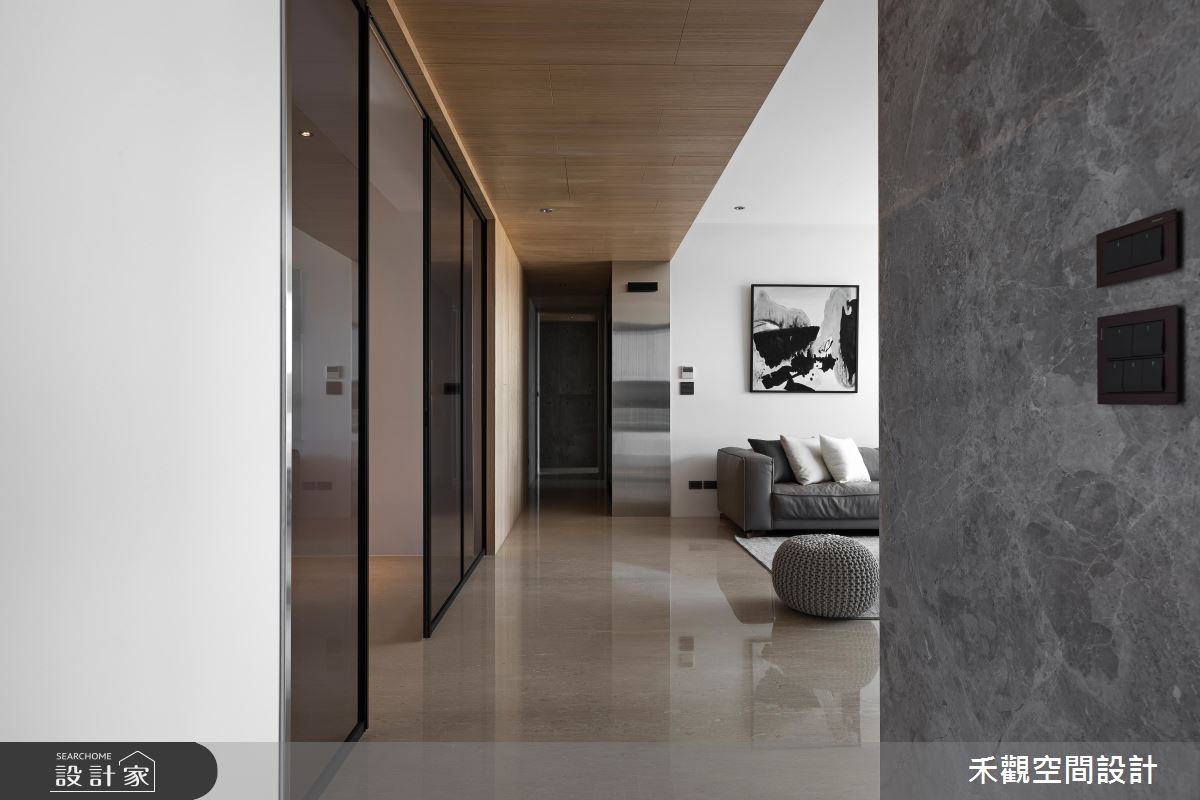 從入口開始以大理石鋪陳地坪,隨著光源的投射,展現明亮、潔淨之意,玄關的兩側更打造收納與展示區,滿足生活實用之需,甚至安排一處衣帽間,方便屋主進出時整頓儀容;玄關到客廳的廊道上,天花板以木紋舖陳,暖色調的自然質感帶來溫潤的空間氛圍;日光隨著落地窗引入客廳,映照出分明的兩側壁面,白色飾底的沙發背牆,烘托藝術畫作之美,對面則以深咖啡色系的原木質感,搭佐白色調櫃體,且融入電視牆的機能,深淺配色的對比手法,彰顯鮮明的家屋風格,加上展示空間的規劃,創造出日常的人文美學;開放式拉門界定出餐廳空間,讓戶外的光線能夠延伸入室,目光隨著懸掛的燈飾,來到戶外窗景,視野隨即遼闊開來,若有烹調需求,可將拉門關上,度絕油煙困擾,也能保有獨立空間供的使用。