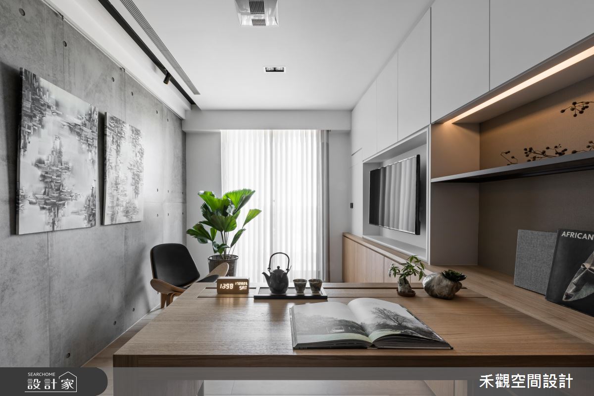 由於屋主需要平日在家辦公,希望有大書房能使用;書房空間裡利用清水模壁面,搭配木紋地板、原木書桌與櫃體的擺設,展現樸實、靜謐的閱讀空間。