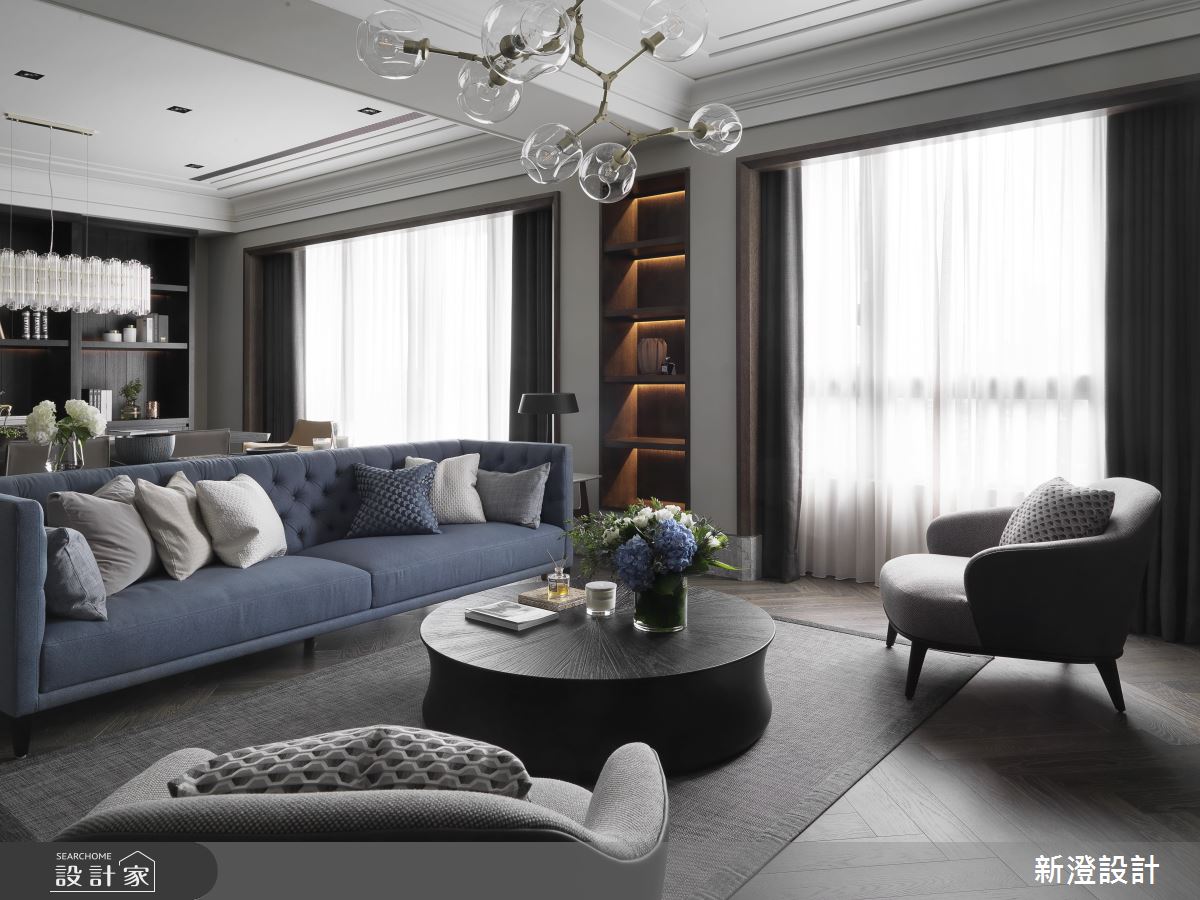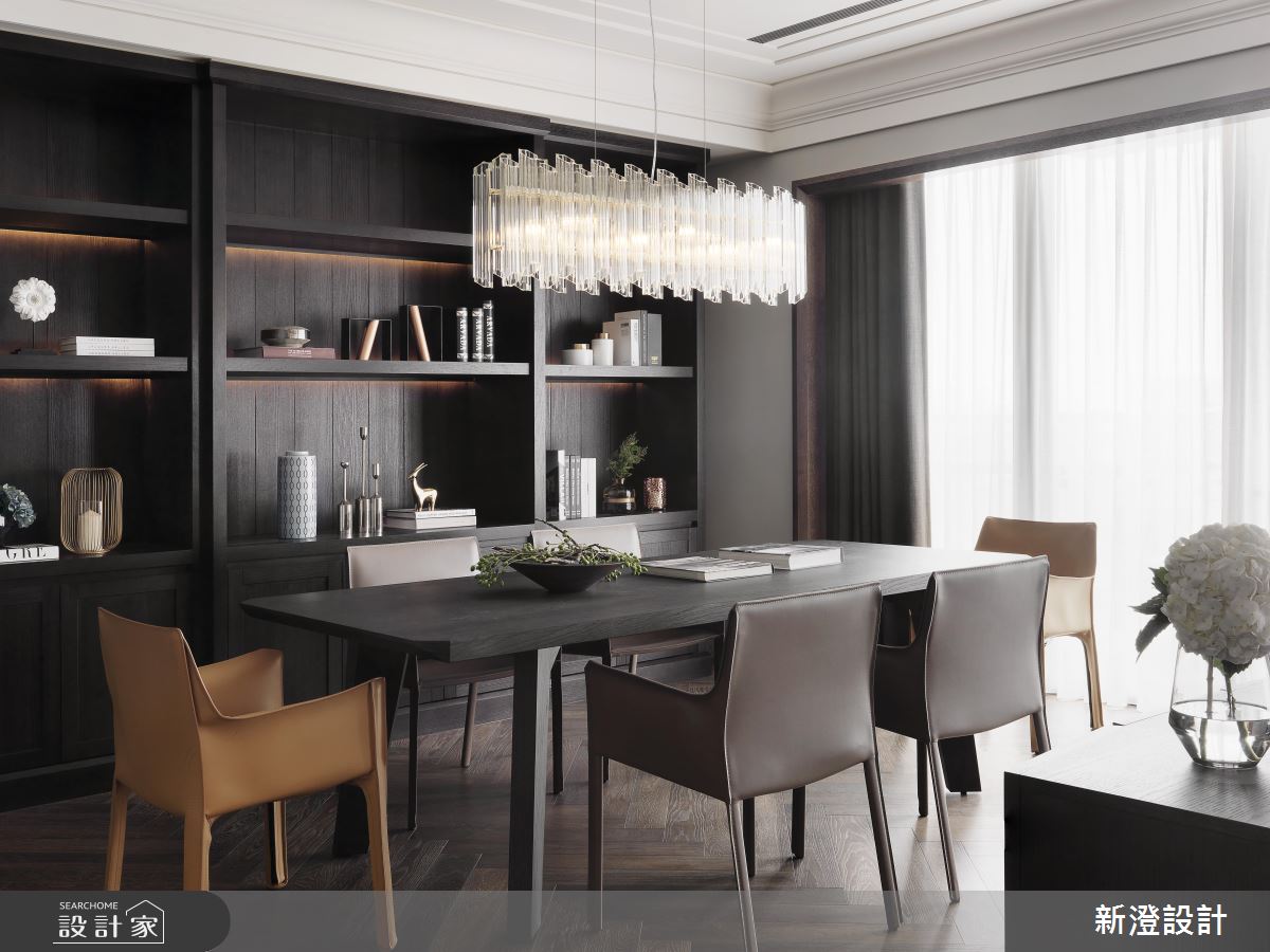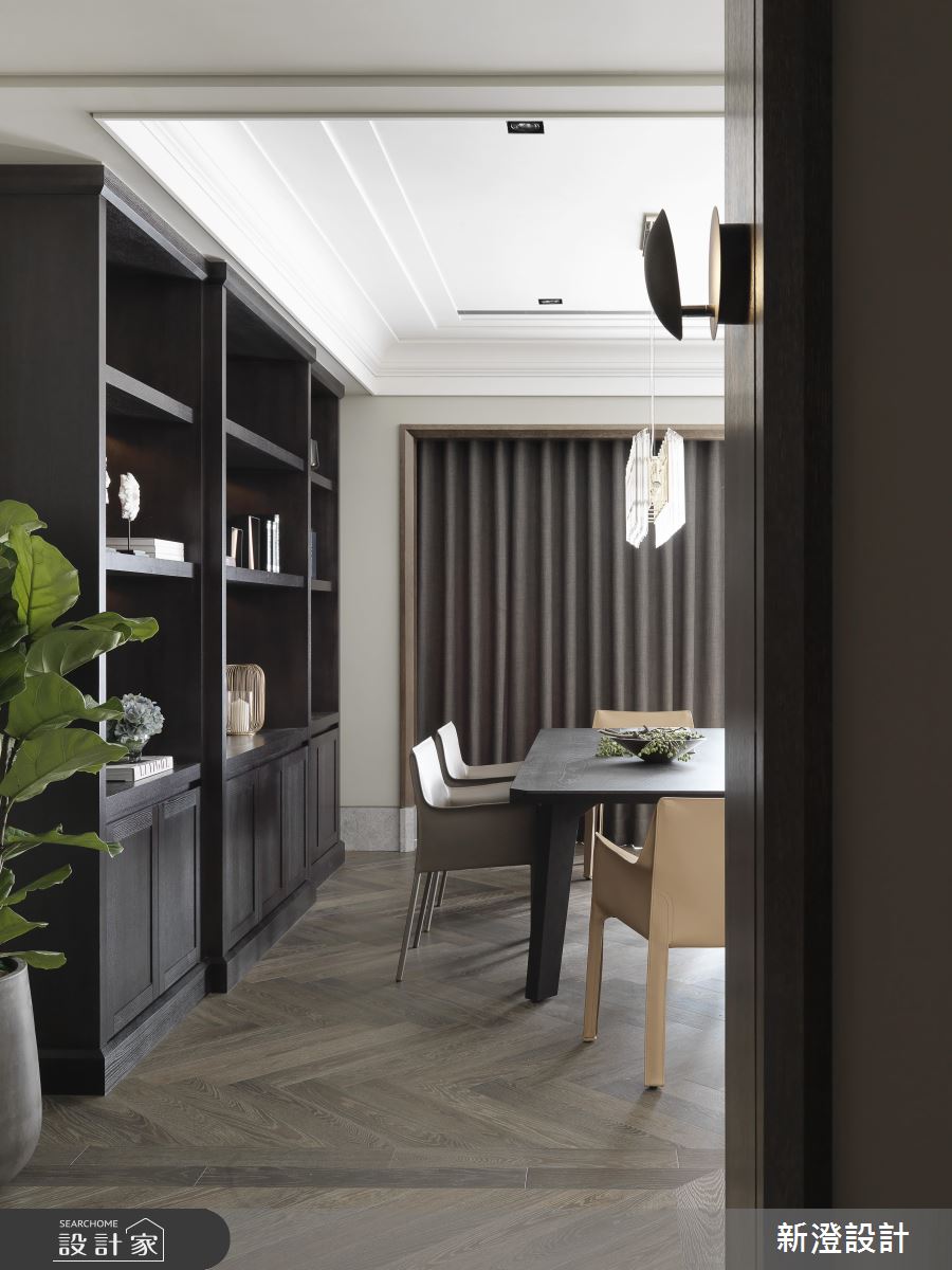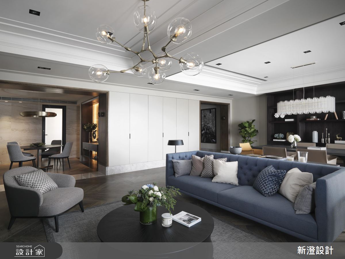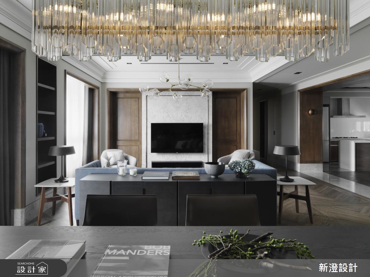設計師巧妙以精選家具,劃分全開放空間中的場域,除了創造回自動線,同時也保留了公領域之中複合式機能、串連書房與客廳並大幅提高互動性。針對大宅質感營造,設計師注入新古典元素,應用人字拼法順應軸線鋪設實木地板,並在天花採用細密的線板框出雅緻層次,佐以造型特殊的懸吊水晶燈飾拉伸天花高度感受。電視牆則應用對襯概念,結合大理石與木皮線板,打造沉穩低奢的感受。針對收納機能,為了不影響開闊動線,皆沿四面牆收攏,創造大面積收納量度。餐廚空間利用吧台串連廚房與餐桌,更延續客廳風格,以石材與木皮打造大器氛圍。