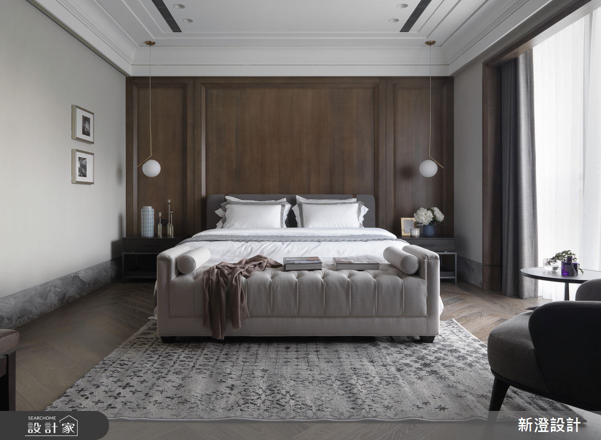 大地色系為基調的主臥,比照歐美規格,結合起居、閱讀功能,成熟的木皮床頭牆佐石紋踢腳板,完成了屋主對現代風大宅專屬質感的期待。