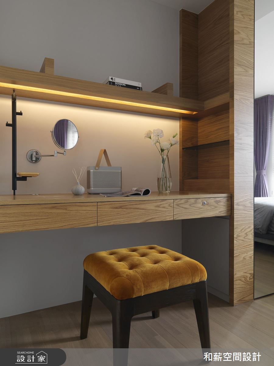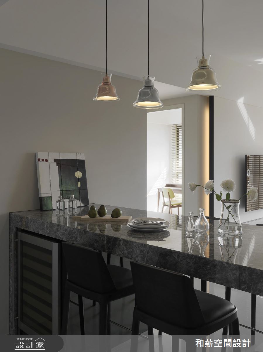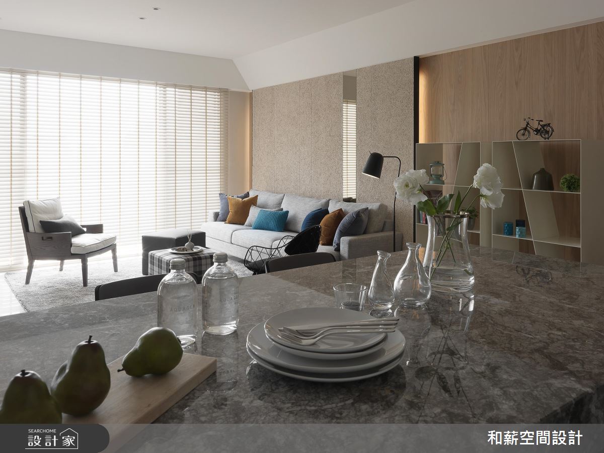 走進這處居所,空間裡漫溢著日光和木皮的溫潤質性,電視和沙發牆面運用間接照明相互呼應,挹注了隱約柔美的層次感,沙發背牆選用大幅的美絲板作為背景,展現木纖維的獨特質感,中間並嵌入鏡帶,豐富了精緻而時尚的感受。因為女主人平常有品嘗紅酒的習慣,餐廳以具有石質紋理的中島設計,取代一般的餐桌家具,搭配優雅高腳椅,讓屋主可以在家裡放鬆、愜意地品飲紅酒。主臥保留了寬敞的行走空間,床頭收納櫃利用簡潔的門片線條,呈現出簡約的時尚感,另一側配有兼具梳妝、閱讀功能的桌面設計,設計師更為屋主打造了鐵件展示架,可收納項鍊、小首飾等,上方的木作層板則可擺放書籍刊物,讓有閱讀習慣的女屋主方便拿取。