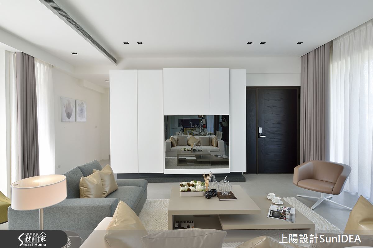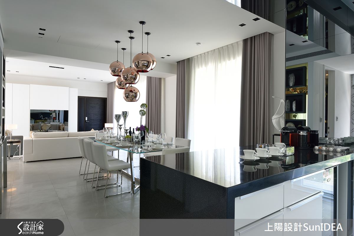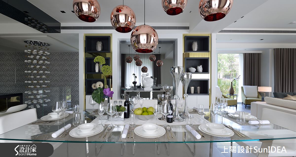 公共場域採以連貫開放的設計型態,一側連結整排窗外綠景,型塑美好度假氛圍,使公領域兼具招待、宴會等功能,同時以白調作為空間基底,妝點金屬、鏡面、玻璃等光亮材質,展現時尚的視覺印象;餐廳則規劃清玻餐桌、鏡面餐櫃,在櫃體飾以金屬材質,與落地窗外綠意互襯,讓光線景象嬉遊其中,衍生通透視感,使白色空間更添層次;私領域則注入度假旅店概念,以旅店套房規格打造臥室,於床頭做出異材質拼接縱向處理,營造視覺的韻律感,且將更衣、睡眠、衛浴等主題完整涵蓋其中;衛浴內透過百葉窗引進日光與窗景,並加入大面積亮黃色塊,替白色主調增添色彩與光影張力!