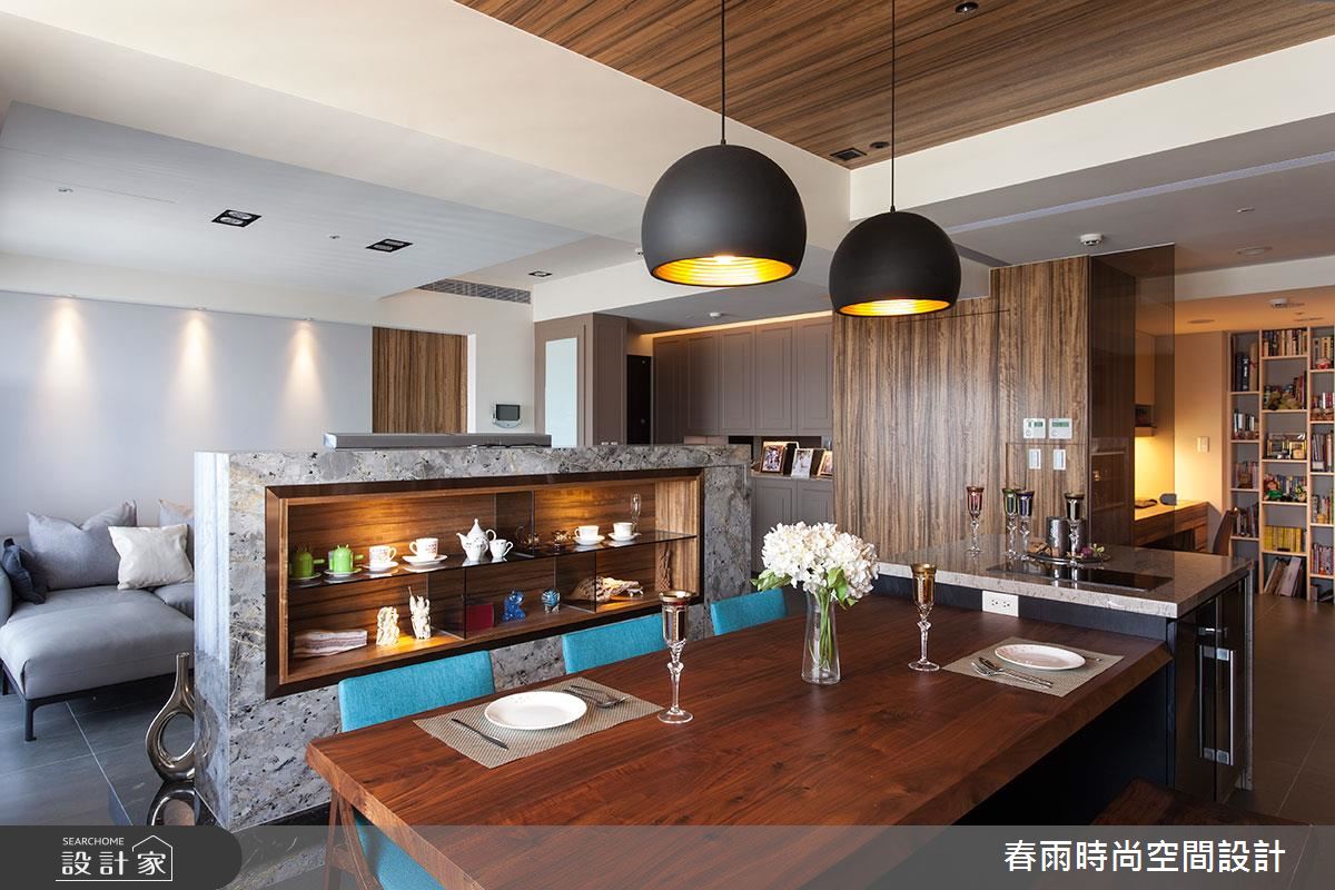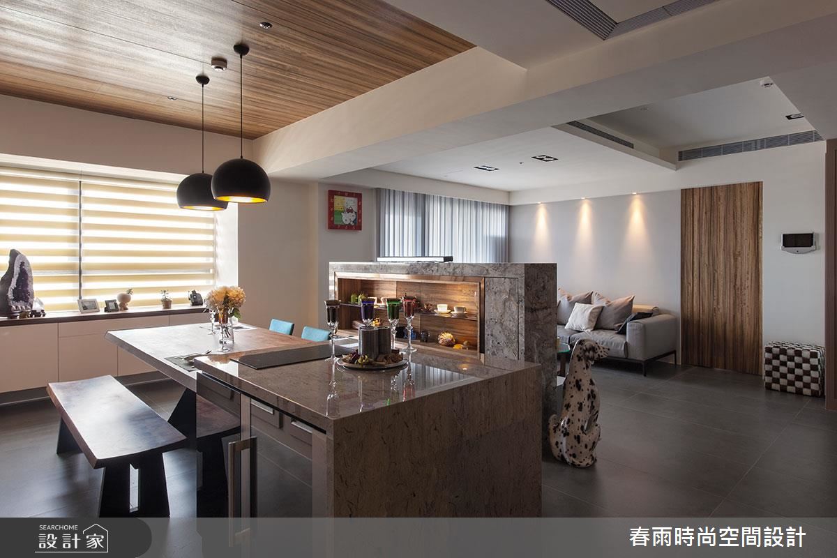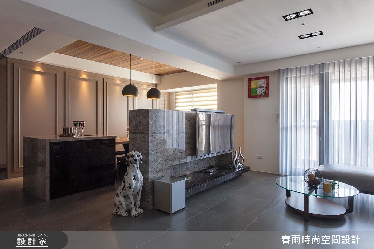 40 坪的現代風居宅,雖曾在預售階段進行客變和調整,卻不是屋主期待中的模樣,因此春雨設計透過專業設計思維,重新將客廳、餐廳和書房調整,透過降低電視牆的高度,後方兼具收納用途,作為兩個場域的界定,並加上茶玻隔間,為全家人打開了明亮寬敞的生活視野。