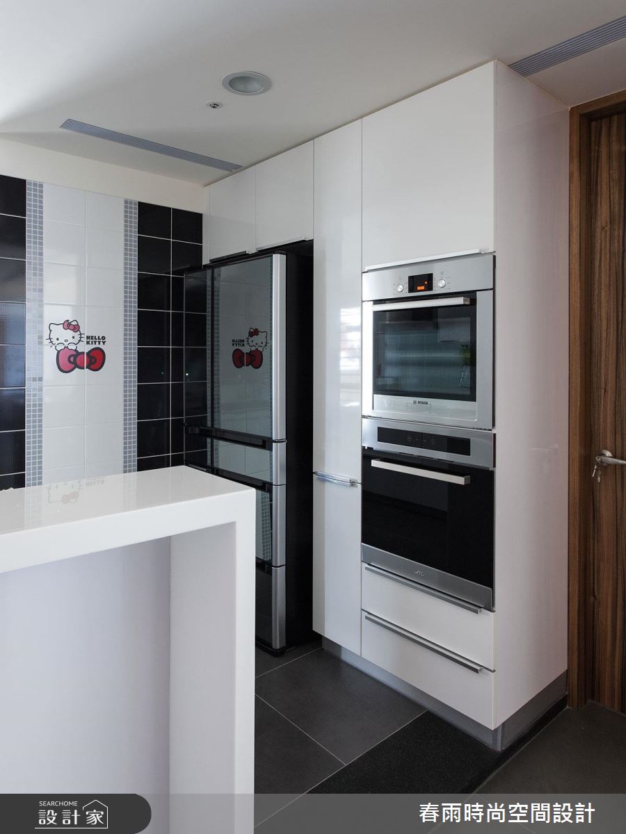 玄關處以馬賽克磁磚在地坪上細膩拼接優雅圖騰,設計師更為女主人打造的專屬 Hello Kitty 廚房,運用黑、白兩色壁磚,讓童趣可愛中也不失俐落和時尚。