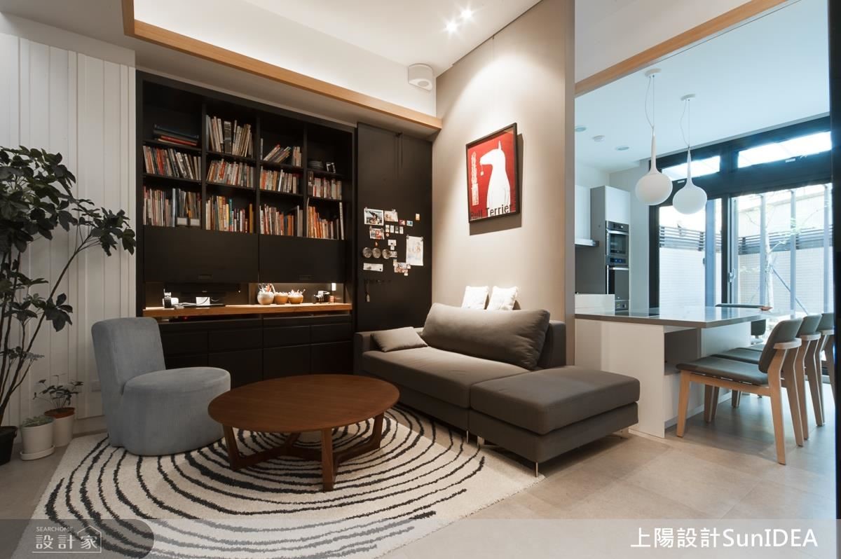 走進室內,餐廚區設置在採光明亮處,結合中島設計,塑造可準備料理和用餐的彈性大空間,並利用短牆與客廳界定,解放了採光的動線路徑。客廳兼具閱讀、上網辦公區等機能性,沙發旁安置的落地櫃體,不僅收納了屋主的眾多書籍,也兼做留言展示牆,門片下更收藏電腦螢幕。電視主牆以木質色調,讓溫暖感充盈整個居家空間,並利用樹木的剪影造型,讓視野得以延伸向上,破除了夾層的狹隘感,後方則是通往次臥的樓梯入口,使電視牆具有多功能的運用。主臥室以時尚現代風格為基調,並另外在上方增設夾層,更加充實了坪效的利用。