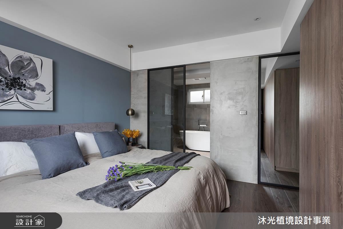 首先針對結構問題,透過適當的空間切分,降低視覺的傾斜感;接著,為了滿足屋主對於廚房、書房與陽台的需求,打造了附中島的開放式餐廚、書房以及可蒔花弄草的陽台。入門長廊以木皮鋪設,產生溫潤的延伸感,緊鄰玄關、帶有大量收納機能的多功能房,以鐵件玻璃拉門與紗簾創造隱私、開放兼具的應用機能。公領域以全開放設計串連,原木餐桌成為大理石質感中島檯面以及客廳、書房的接壤處,進一步化身居家中心。針對色彩搭配,公、私領域皆以灰色水泥漆搭配單寧藍牆面,產生沉穩中不失時尚的跳色選擇。