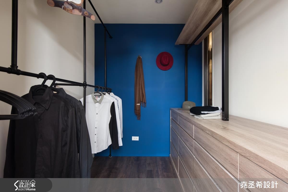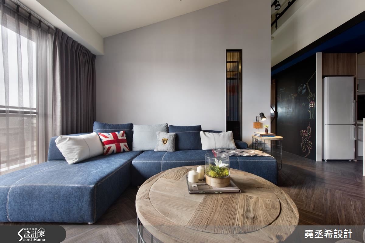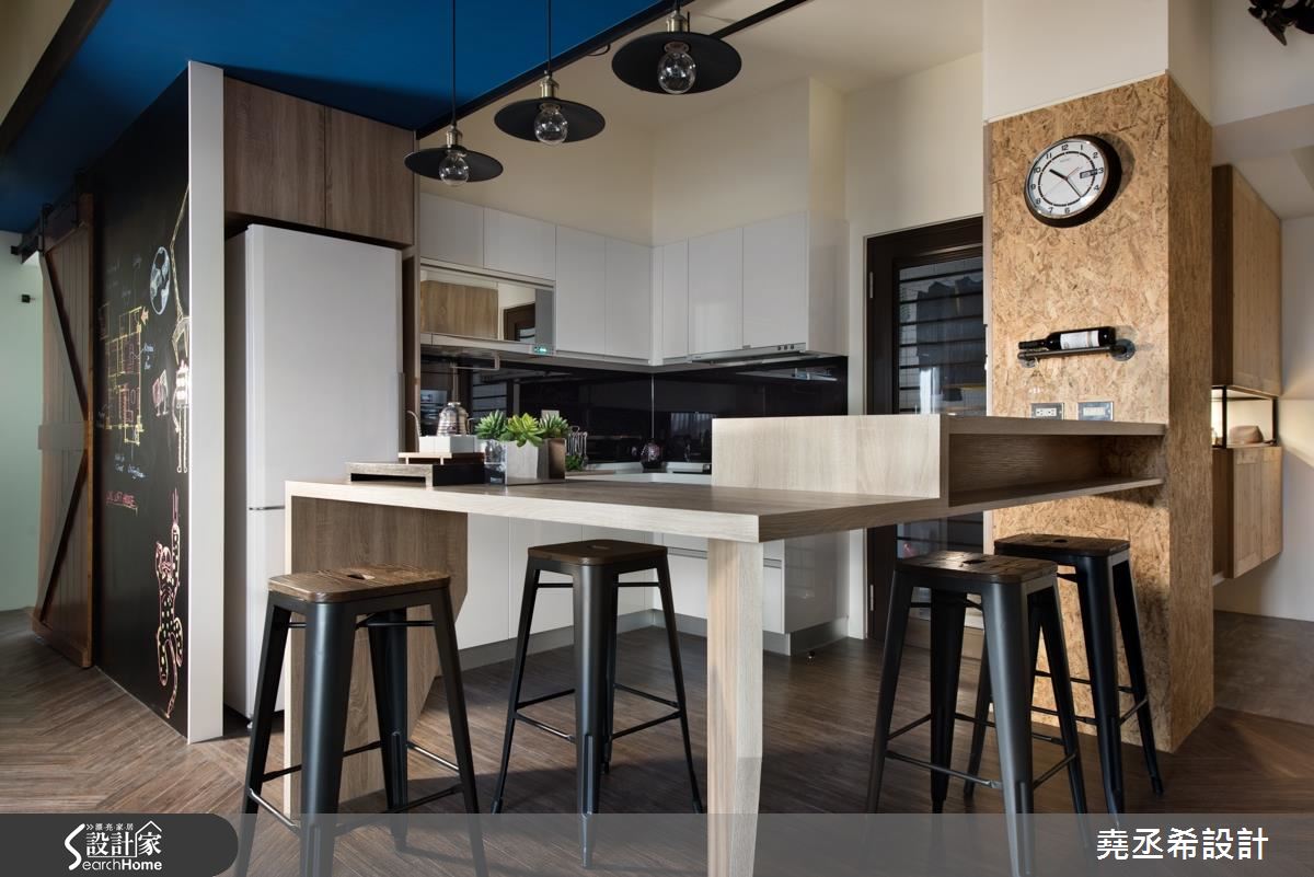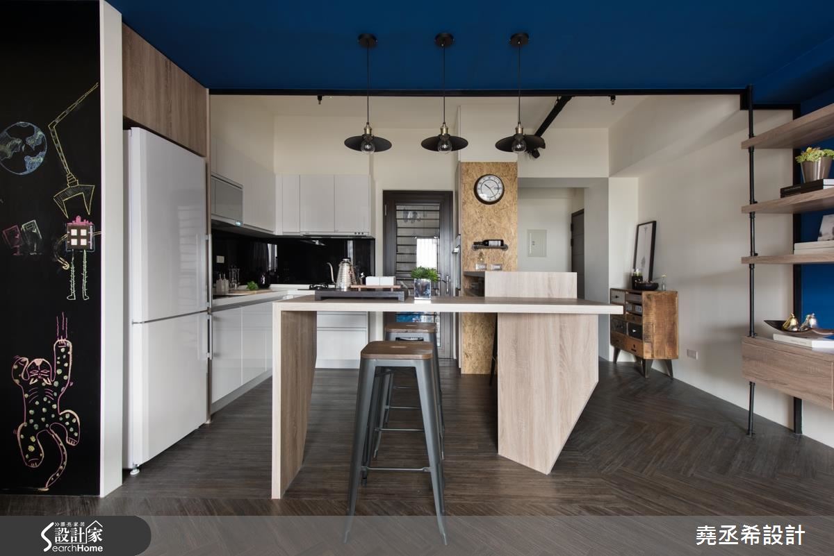 為了描摹出屋主喜愛的 Loft 樣貌,設計師在室內注入磚牆、鐵件、實木板,以及工業風單品等經典元素,地坪以人字拼法刻劃獨特的個性魅力,而牆面及沙發的灰、湛藍、藍綠色等色調,也讓色彩的變化上更加豐富。家人最常使用的廚房區域,採用開放式設計,使空間更加寬闊自在,並捨棄傳統餐桌椅的規劃,改設 L 型多功能吧檯,一次滿足料理、用餐、電器廚具儲物的需求,搭配鐵製高腳椅和吊燈,也相當有工業風咖啡館或是餐酒館的情調;主臥室則延續簡約清爽的調性,再隔出更衣間,讓收納機能更加完備。