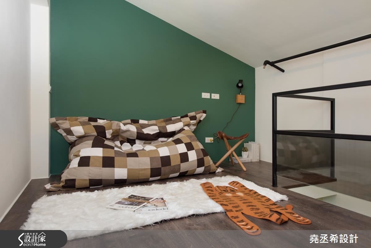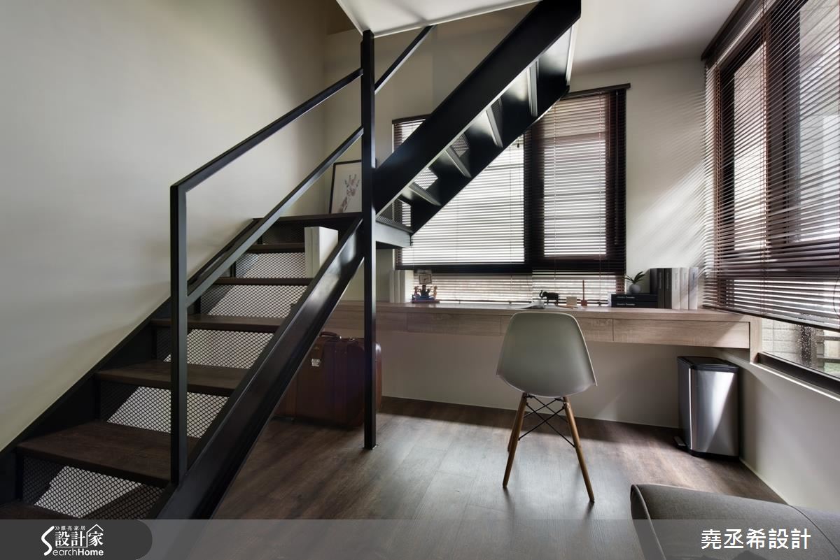 位於大樓頂層、屬於新婚夫妻的 30 坪住宅,具有樓高 4 米 7 的開闊高度,以及非常有特色的斜屋頂,雖然選擇極具前衛個性的工業風,但設計師也透過色調、織布材質保留清爽舒適的居家生活感,並在室內最高處隔出閣樓夾層,在書房上方額外增加 1 房,可做為未來小朋友的遊戲區及客房使用。