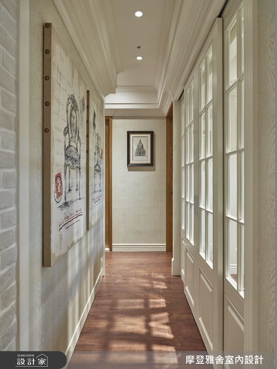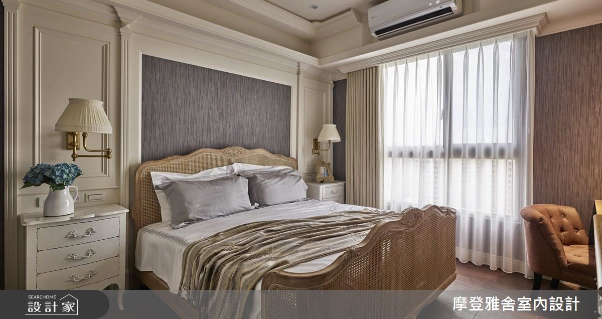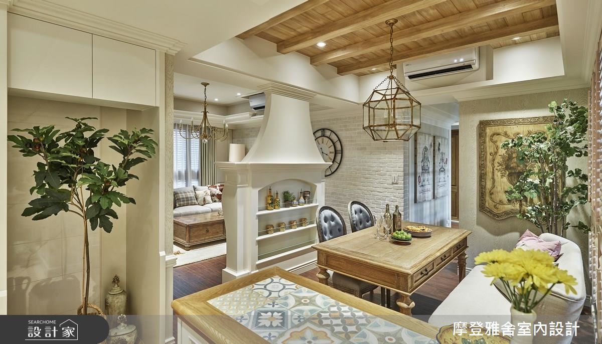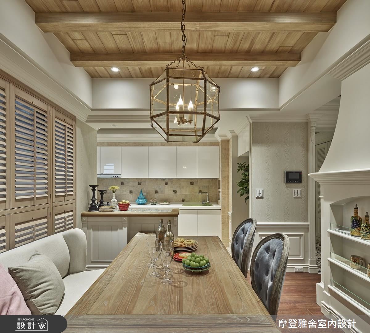 設計師打開客餐廳的界線,透過半開放電視牆的座立,導引餐廚、客廳之間的流暢動線,營造一家人之間的生活互動樂趣,沙發後方則運用窗面引入採光,並規劃一面展示書牆,讓客廳也容併閱讀書房功能;同時採用線板與挑高作法修飾天花板,搭配木質包覆樑柱,締造場域之間的各自界定;餐廳區在木造天花、木百葉窗的包覆之下,充斥溫潤氣息,從細節到風格皆完整到位,古銅金色的吊燈更與客廳主燈相互呼應,恰如其分地顯出微奢華的魅力;主臥內,則在一派白色主題當中寄寓質感內涵,藉由精雕的線板疊砌壁板與天花,顯現細膩氛圍,搭配沉靜的壁紙色調,詮釋使用者的優雅品味!