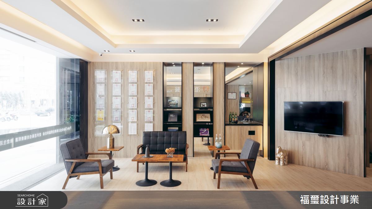 設計師在天花板挹注層次線條,搭佐間接燈光的嵌入,讓整體氛圍更加溫暖柔美,而為了讓空間獲得足夠寬敞感,除了透過鏡面、玻璃提升視覺穿透性,也刻意藉由不規則的斜切壁面角度,緩解入口處的侷促感;並加入沉穩石材、都會感軟裝,與輕盈木色和諧共處,展現現代都會風情,同時在牆面規劃展示牆、書報櫃與洗手檯等複合式機能,將一切便利機能整合在同一道立面上,美觀亦不浪費空間;診間內,則在牆面加入展示機能,增添視覺趣味,搭佐霧面玻璃的隔間處理,貼心保護患者隱私!