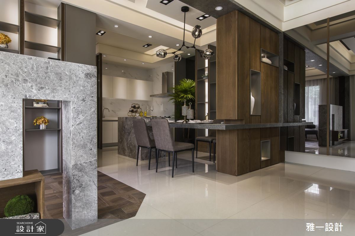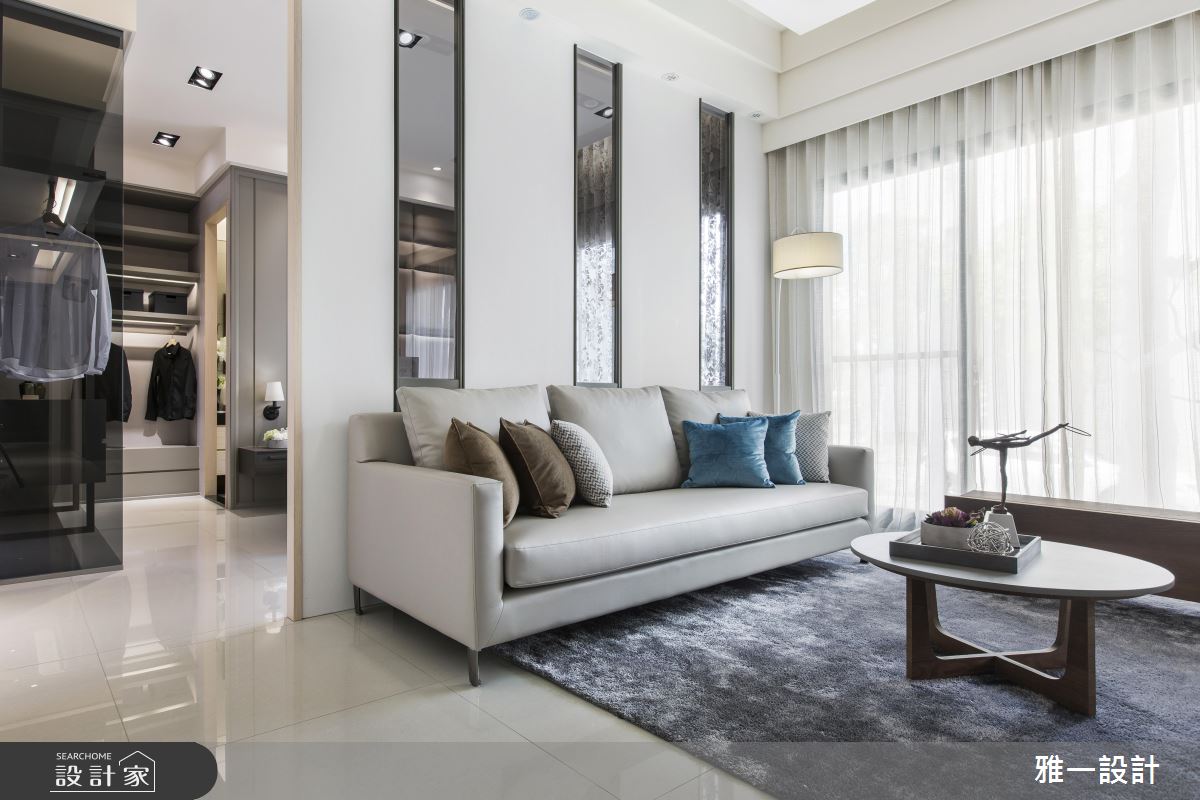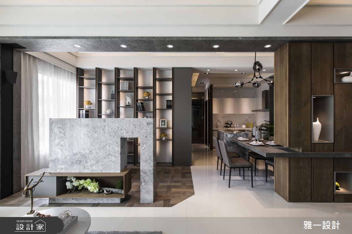 本案以「繞」為主題,巧妙以動線規劃與建材應用創造了視覺空間,首先以開放設計串連客廳、書房與餐廳,接著利用雙面電視矮牆為客廳與複合式書房打造回字動線,此為第一繞。另外,由玄關延伸的薄片石材不僅修飾了大樑,更繞過屏隔櫃體形成餐桌,達成一氣呵成的第二繞,用環繞的意象創造父母對於這個家的守護信念。主臥抹除門片,利用灰玻與客廳連結,產生穿透感,並將開放式衣櫃延房間軸線設置,結合更衣間概念。次臥利用色調輕淺的系統家具達成機能、風格兼具的舒眠空間。