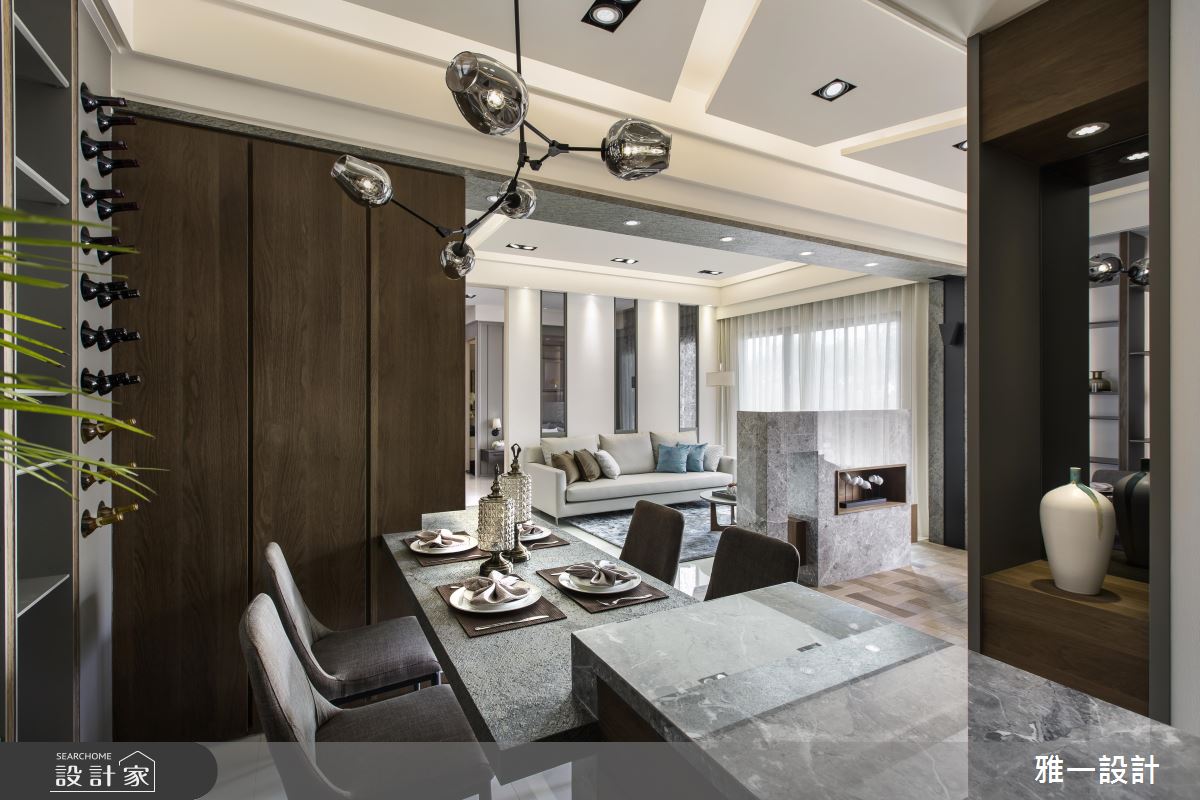 設計師在細節的斟酌與掌握別出心裁,開放式書房的地坪以十字拼木地板創造生動地扭結效果;而餐廳的收納櫃,特別為了屋主的酒藏特別量身打造酒櫃洞板,成為特殊的居家端景。