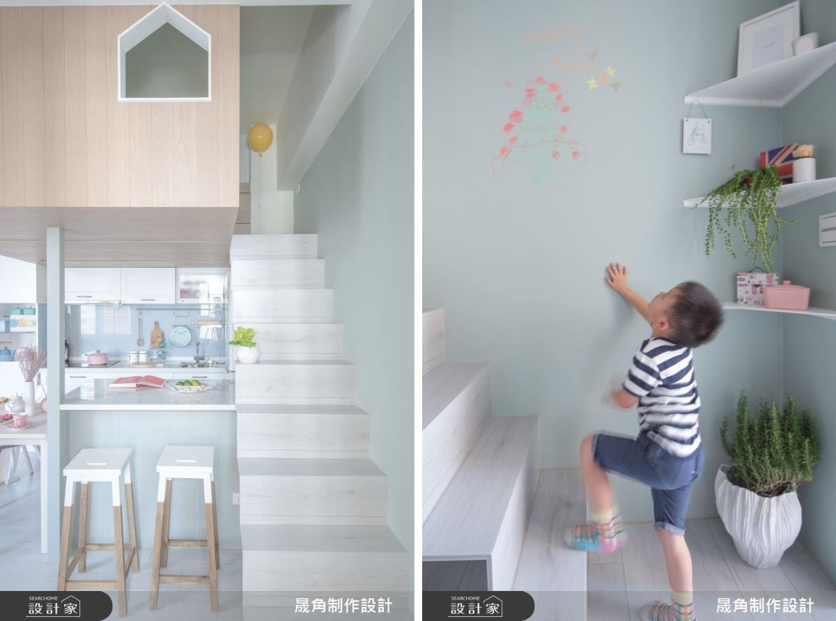 樓梯的那面牆則塗滿淺色黑板漆,成為小朋友最佳的塗鴉天地;轉角則利用三角層架做出展示空間,完全不浪費(右圖)。