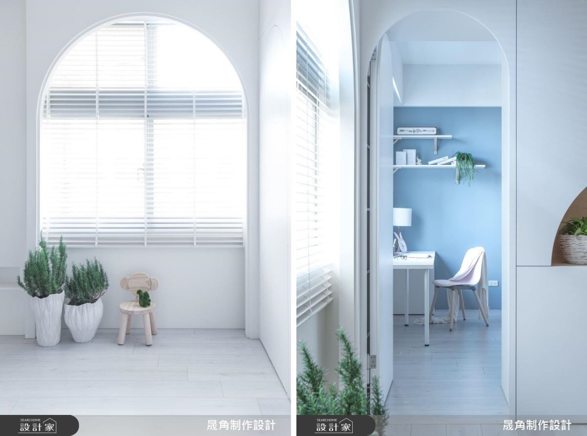 原來的窗戶夠大,能夠迎進令人羨慕的自然光,但香檳色的鋁窗實在跟北歐風格的空間主調格格不入。不必花大錢敲掉窗戶重做,利用木百葉就能輕鬆換得一窗好心情,搭配圓拱造型的木作,變成美麗的角落(左圖)。
