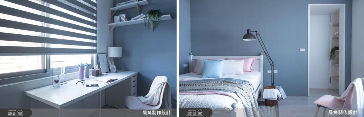 在有限的預算下,利用粉刷就能創造空間的質感。主臥室大膽以沉穩內斂的灰藍色作為主調,配合單純又俐落的書桌及層架,成為文青氣息濃厚的閱讀角落(左圖)。
