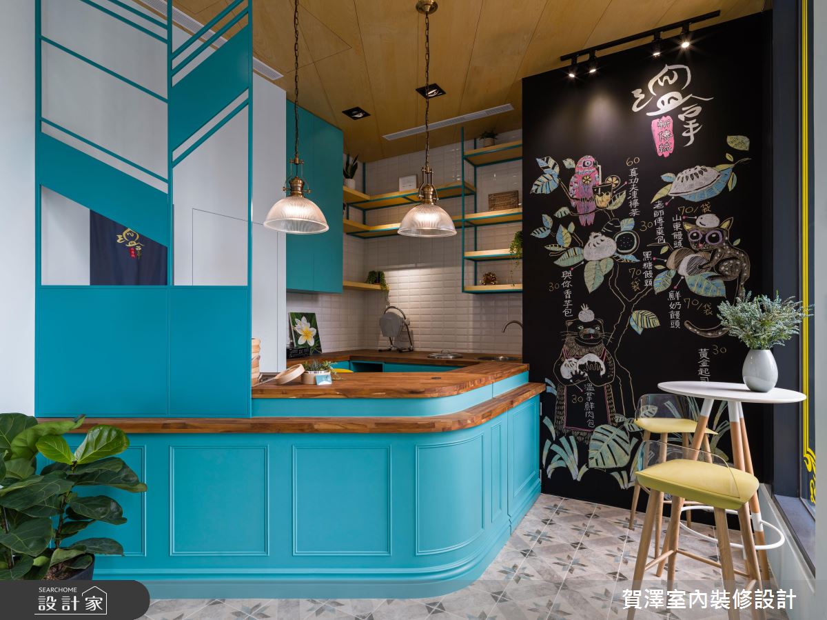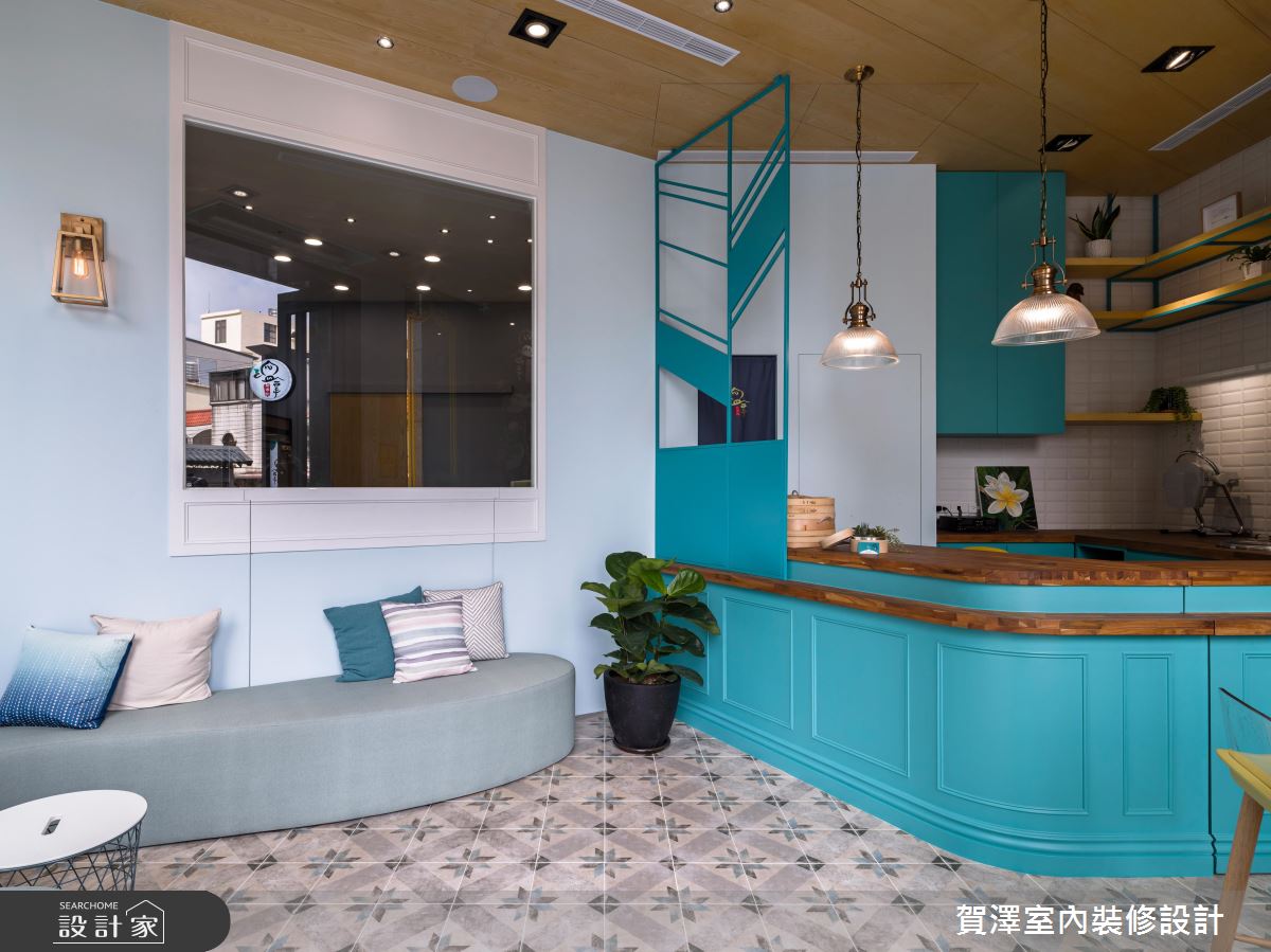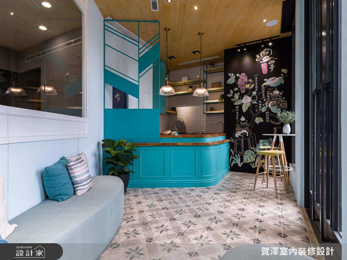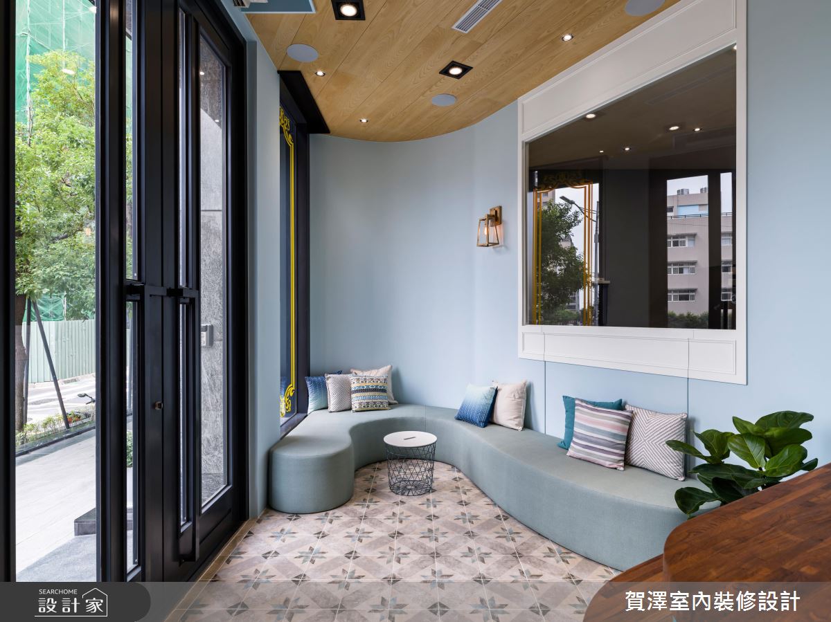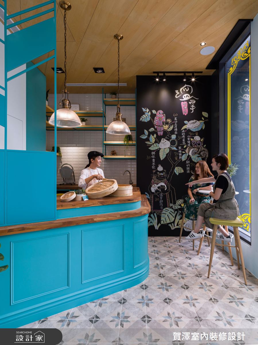 首先,針對店面布局,在天花與地坪以不規則的幾何形狀形塑空間,增添了屬於包子形狀的意象,並切分為等候、櫃檯與內部工作區域。在風格營造上,分別利用灰藍色與天空藍包覆等候區與櫃檯,並在地板上鋪上復古花磚,營造清爽的北歐特色,接著在櫃台邊以凹折鐵件展現力度,與透明玻璃窗相互呼應,型塑框景畫面,並搭配金屬吊燈與鐵件層架注入工業氣息。在色彩搭配上,牆上大面積藍色調搭配同色系不規則沙發與軟件,窗框則採用鮮黃色裝飾點綴,大面積黑板牆則收攏底部視覺,更能繪出特色菜單。