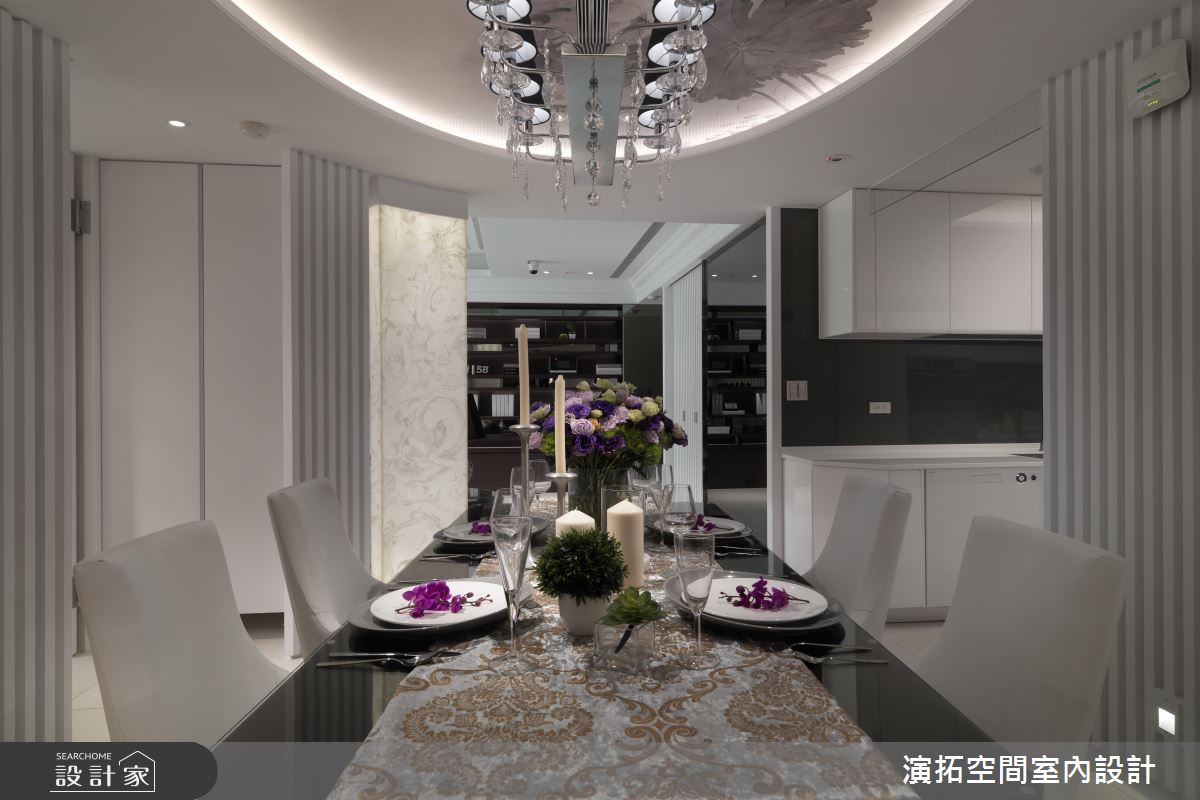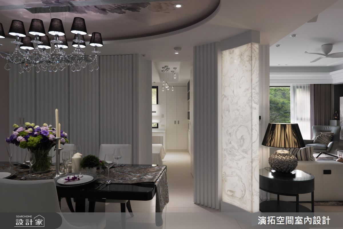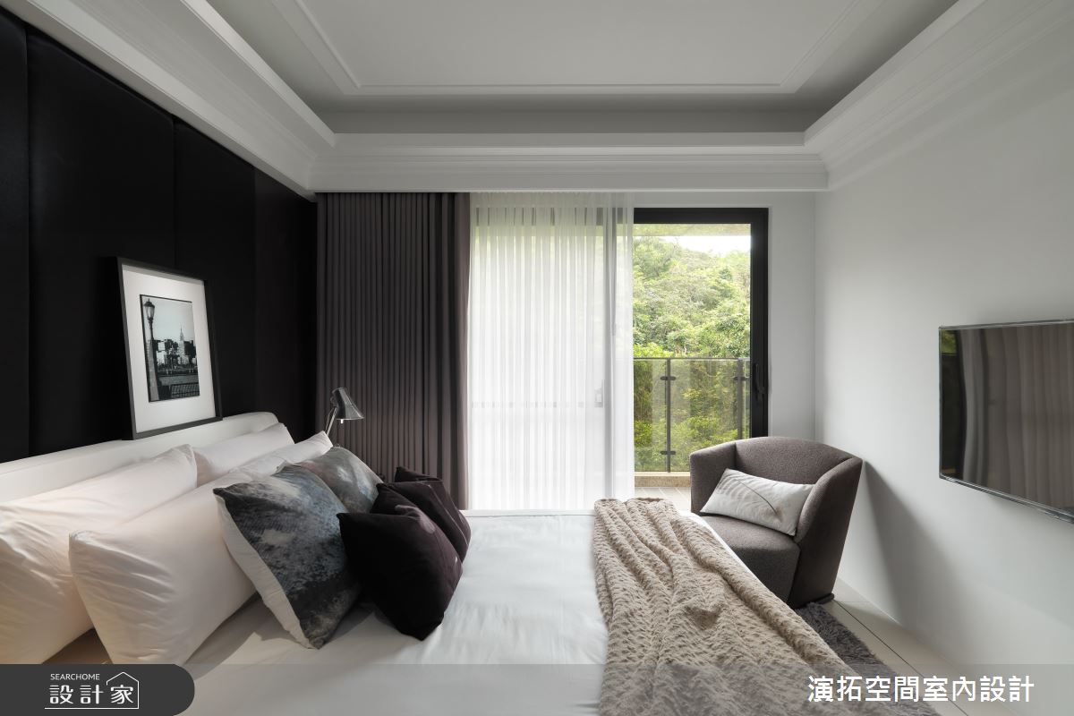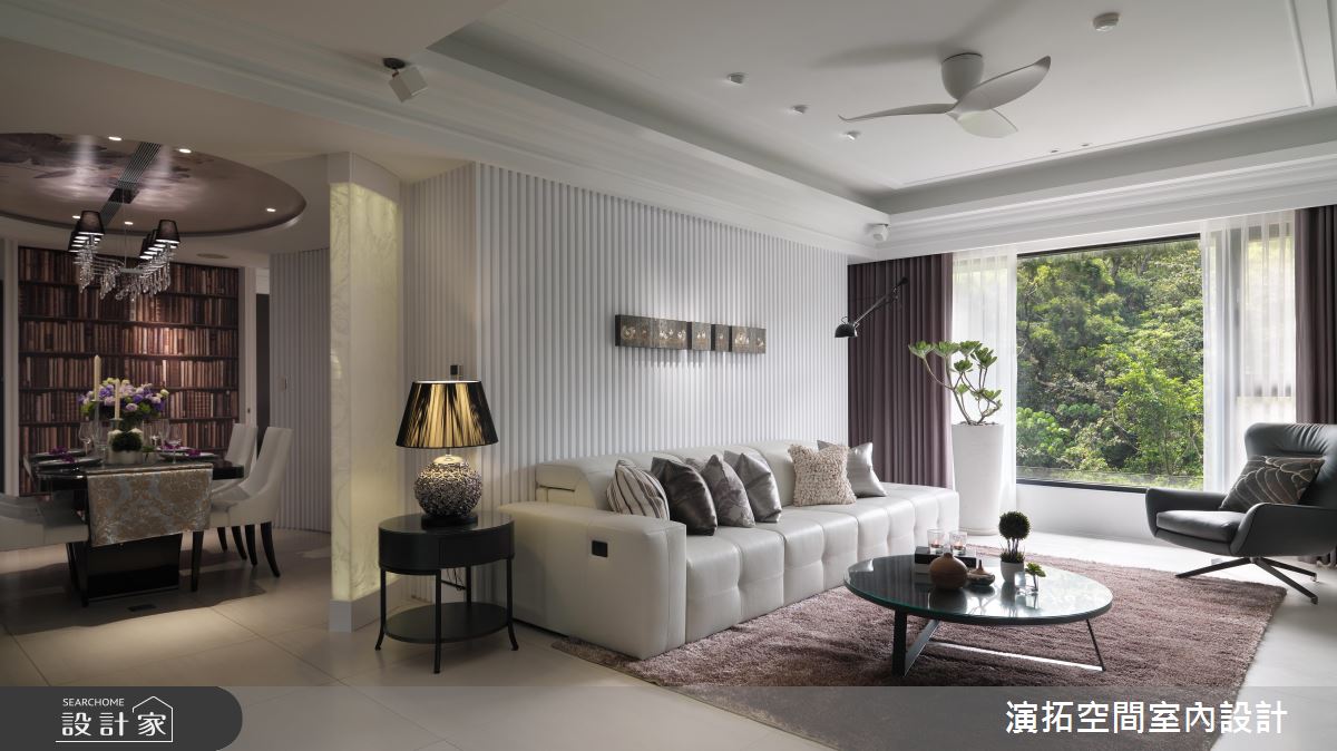 空間整體以白色作為底調,與戶外綠意相互調和,在奢華感之中添注舒適氛圍,並採用大理石疊砌電視主牆,搭構深色木作與鏡面妝點,串起廳區與玄關的關係,沙發背牆則刻意加入垂直線條,搭配立體裝飾品引導視覺焦點,頗富藝術質感;循著動線深入餐廳,則可見刻意為之的圓弧狀格局處理,搭配天花圓頂造型,四周更將餐櫥櫃隱於圓弧壁面之內,展現平衡圓融之感,同時鋪敘書櫃壁紙呈現視覺趣味,與客廳的交接處,更加入透光石牆作為裝飾端景,處處盡是別出心裁的設計亮點;主臥場域內,採以繃布包覆床頭牆,選用大膽的黑色調帶出個性,搭配坐落於窗邊的舒適單椅,讓居住者隨時可在此小憩,與天光美景相伴!