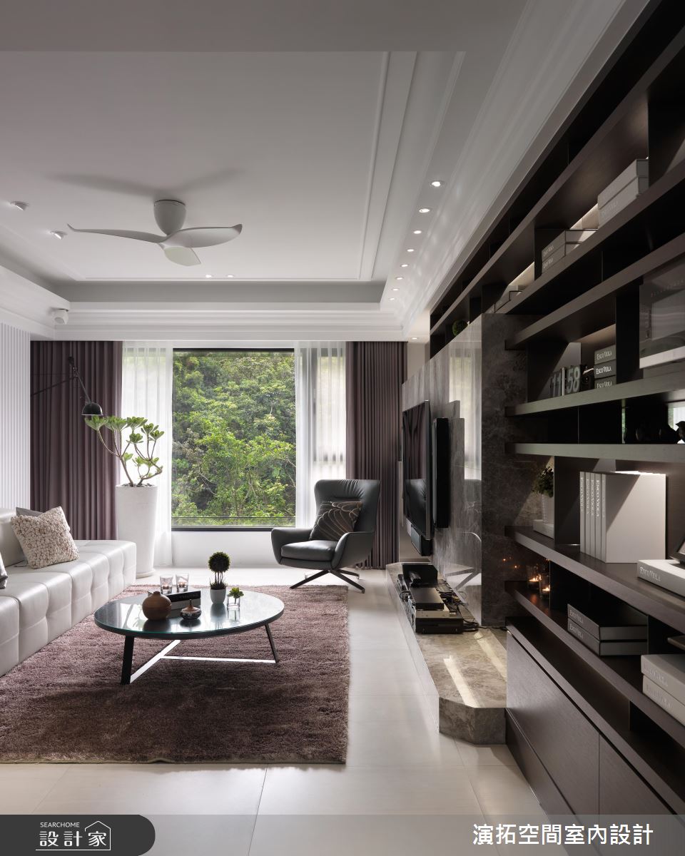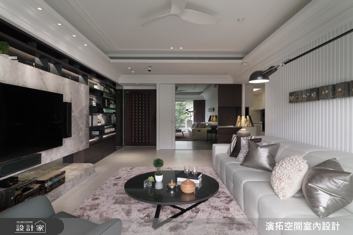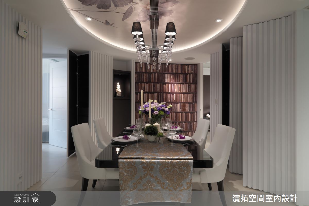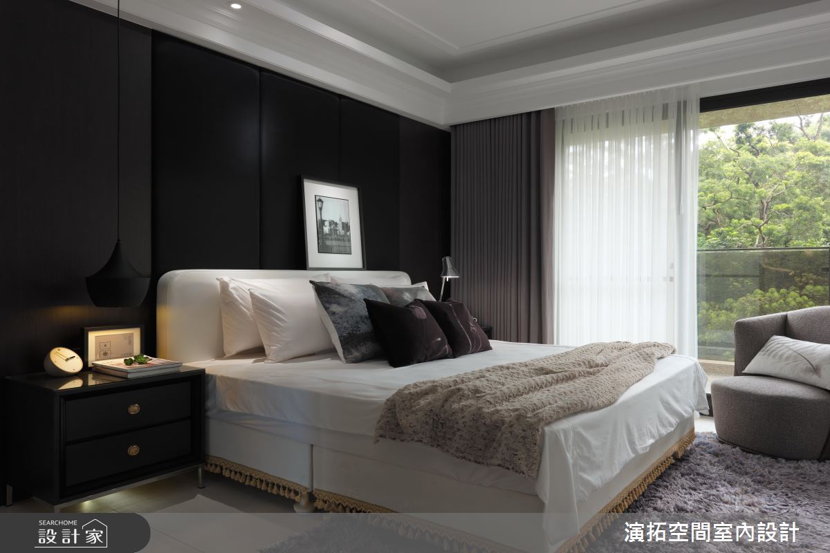 空間整體以白色作為底調,與戶外綠意相互調和,在奢華感之中添注舒適氛圍,並採用大理石疊砌電視主牆,搭構深色木作與鏡面妝點,串起廳區與玄關的關係,沙發背牆則刻意加入垂直線條,搭配立體裝飾品引導視覺焦點,頗富藝術質感;循著動線深入餐廳,則可見刻意為之的圓弧狀格局處理,搭配天花圓頂造型,四周更將餐櫥櫃隱於圓弧壁面之內,展現平衡圓融之感,同時鋪敘書櫃壁紙呈現視覺趣味,與客廳的交接處,更加入透光石牆作為裝飾端景,處處盡是別出心裁的設計亮點;主臥場域內,採以繃布包覆床頭牆,選用大膽的黑色調帶出個性,搭配坐落於窗邊的舒適單椅,讓居住者隨時可在此小憩,與天光美景相伴!