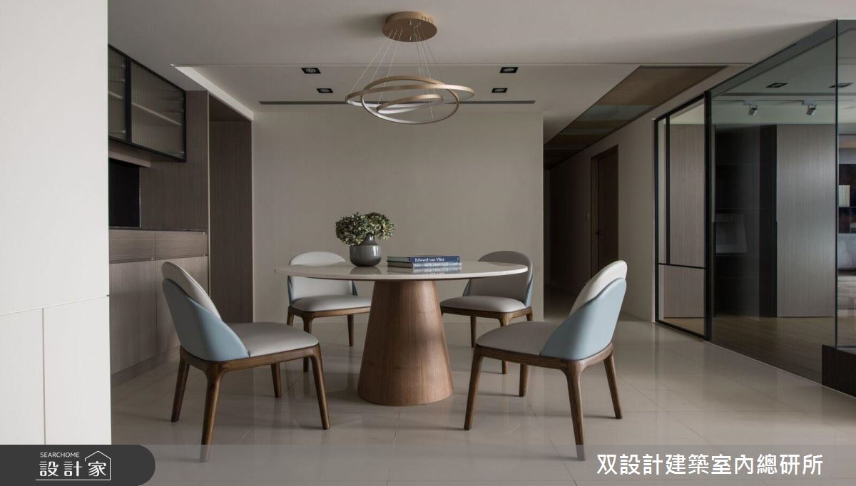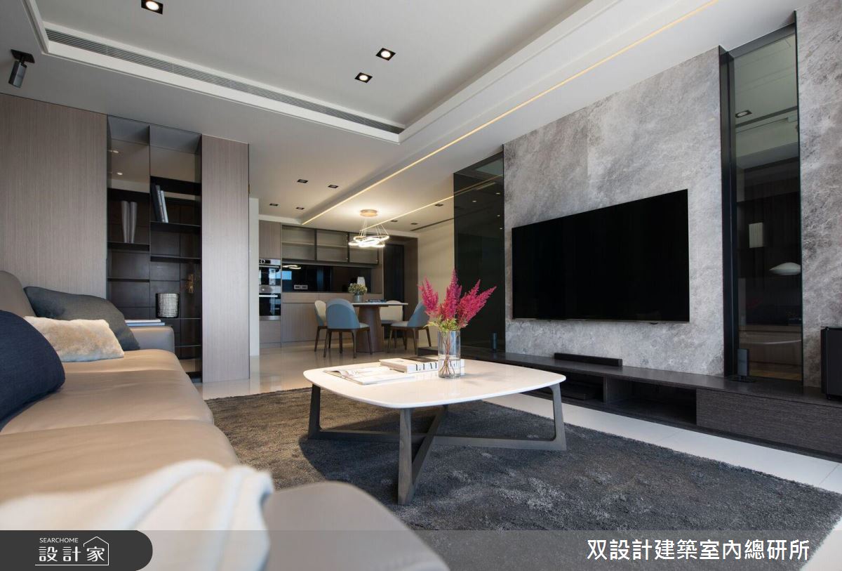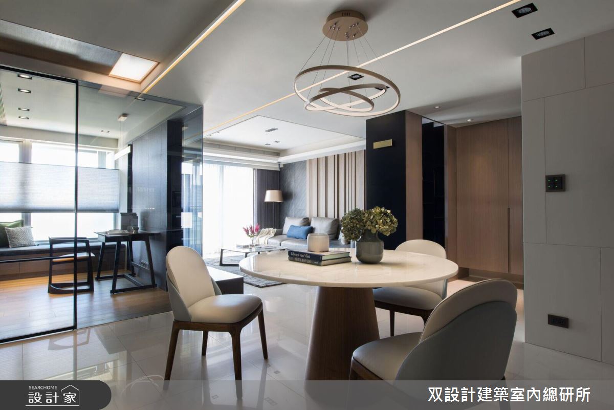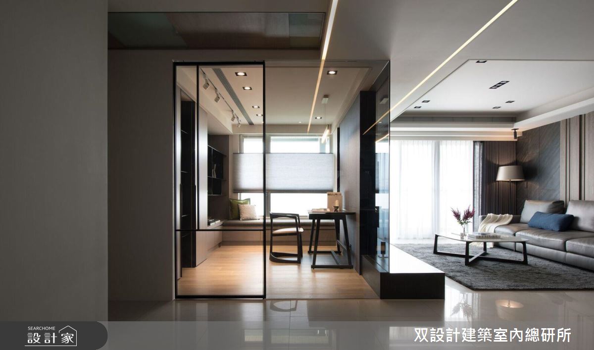 空間採以簡約色彩交織,締造沉穩的現代表情,電視牆選用白色大理石和黑玻對比穿插,沙發背牆則採用深色板岩拼貼木作鋪敘,在剛硬與溫潤的材質搭配下,組構出協調的整體氛圍,同時因應 T 字型的大樑存在,將天花加以修飾,以高低差設計佐以燈條勾勒,緩解天花的壓迫疑慮;原先的客房則加以拆解,變為半開放式書房,藉由黑玻的穿透處理,保有領域視線的交流性,內部更延伸出一處窗邊臥榻,讓閱讀機能與休憩功能並具;而為了增加用餐區的功能性,於餐廳旁則增加了一排餐櫃,提供收納與展示功能,通往廚房的入口也變更門片,改成隱藏式玻璃滑門,讓視野更為延伸,且同步兼具阻隔油煙效益!