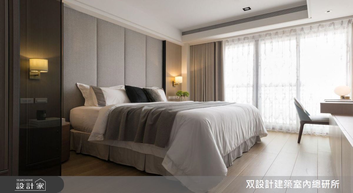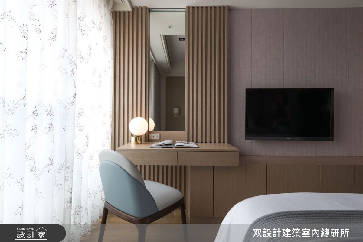 主臥略帶女性化的柔美氣息,選用粉色繃布打造床頭,消弭現代風的俐落剛硬感,梳妝檯更加入巧思,藉由木質打造彈性門片,將收納與化妝鏡整合於其中,讓立面風貌更為完整美觀!