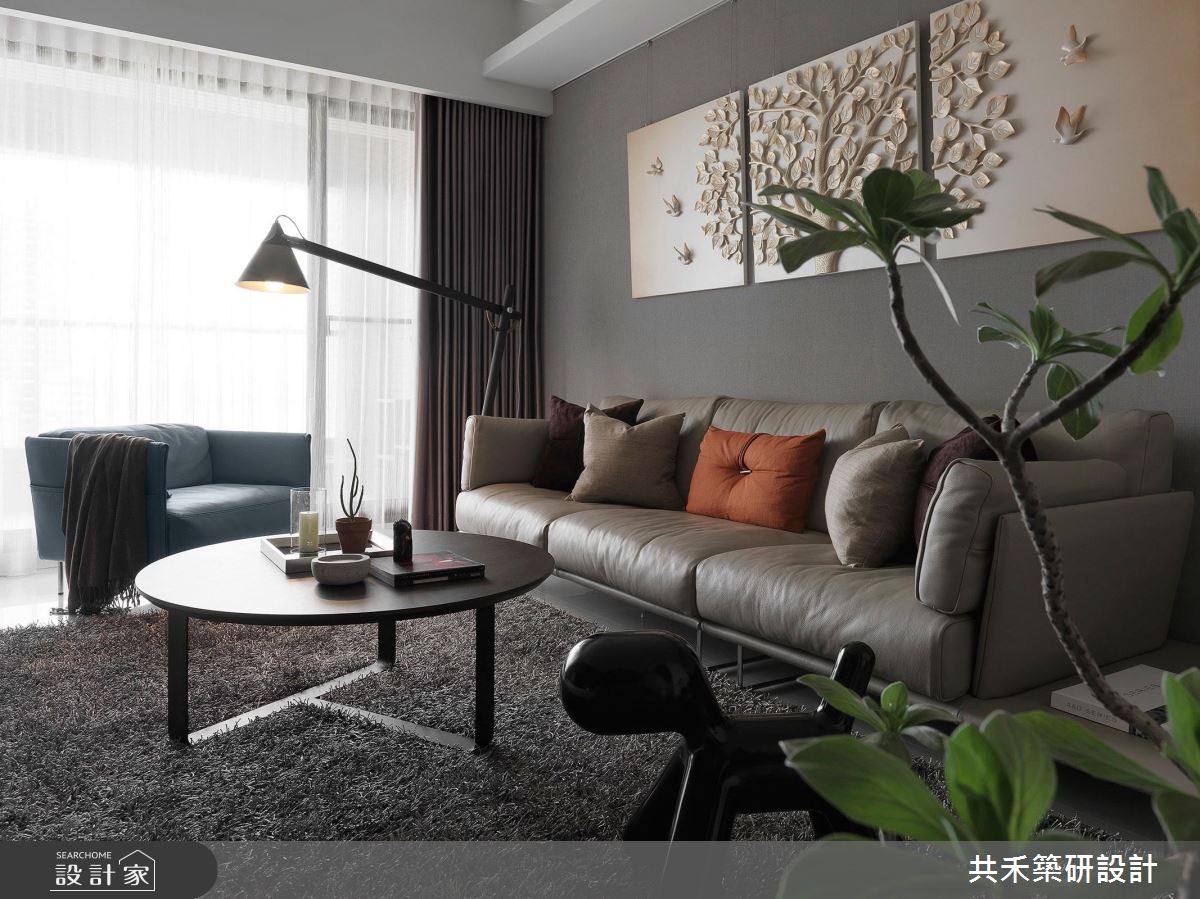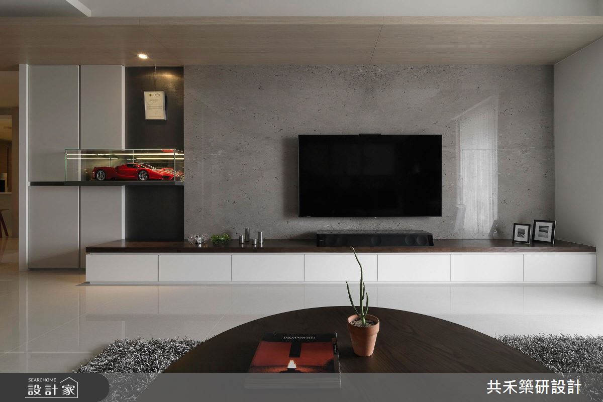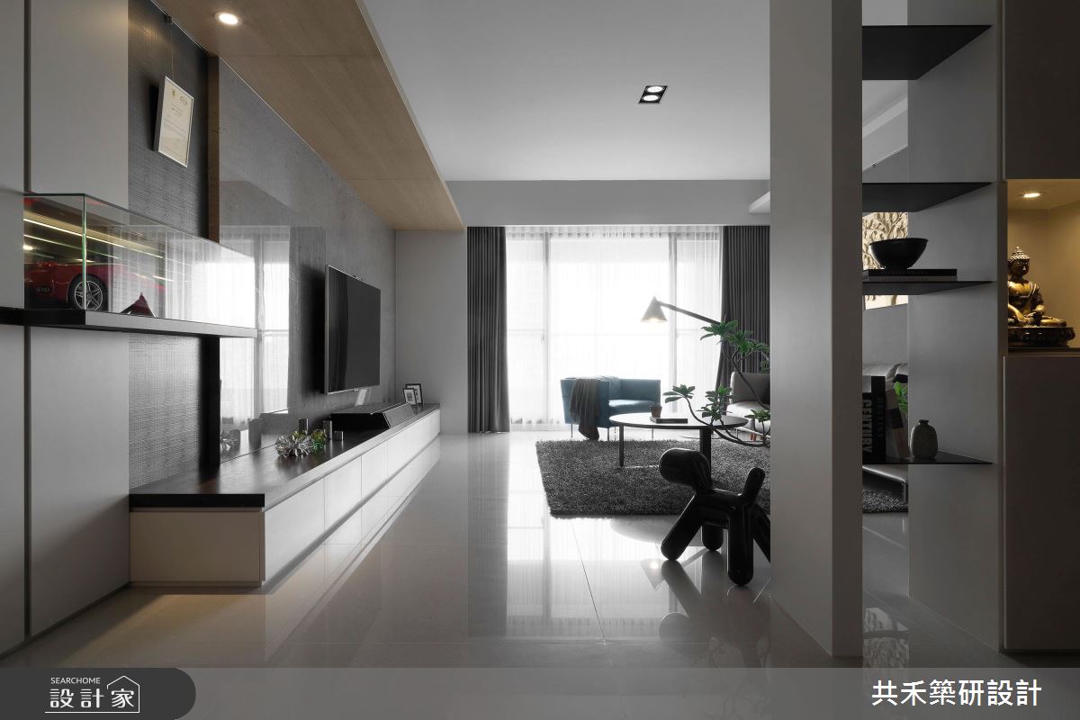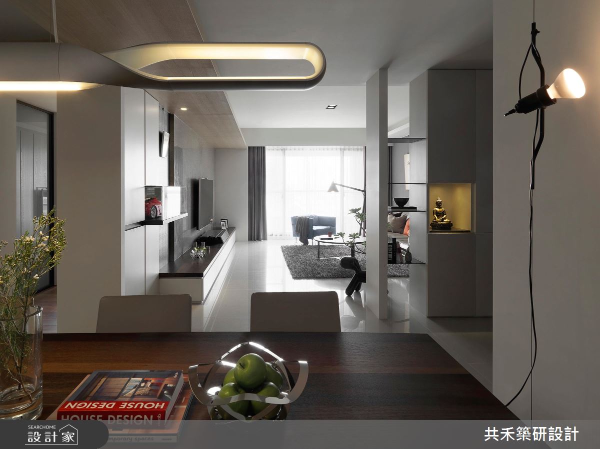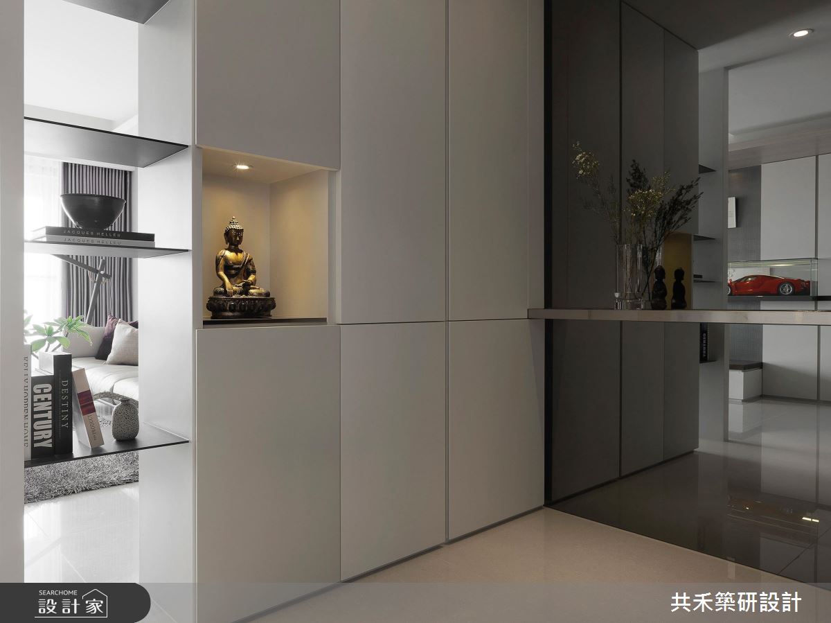 空間引用清冷的灰色調作為基底,塑造簡潔俐落的特質,採用素雅壁紙鋪敘沙發背牆,掛上幾幅藝術作品,凝聚居宅的藝術氣質,同時導引明亮採光照映,搭佐獨特的家具及擺飾,讓整體不顯呆板沉悶,反倒流露出敞朗明媚的舒適度,尤其電視牆旁的跑車模型展示、玄關的佛像擺設等,更帶出了屋主的收藏品味;電視牆上方則運用木作包覆樑體,間接修飾掉大樑的壓迫感,且同步引導視覺動線,串起客廳與餐廳的關係;書房捨棄既有的隔間拉門,以開放式型態締造更深遠的空間景深,藉著地板建材差異做出區域界定,創造不一樣的場域氛圍,房內更規劃一整面書牆,加入特色爬梯設計,不僅型構趣味裝飾,也兼顧了拿取書籍的實質功能,營造出充滿趣味的立面段落!
