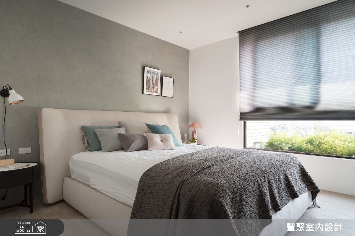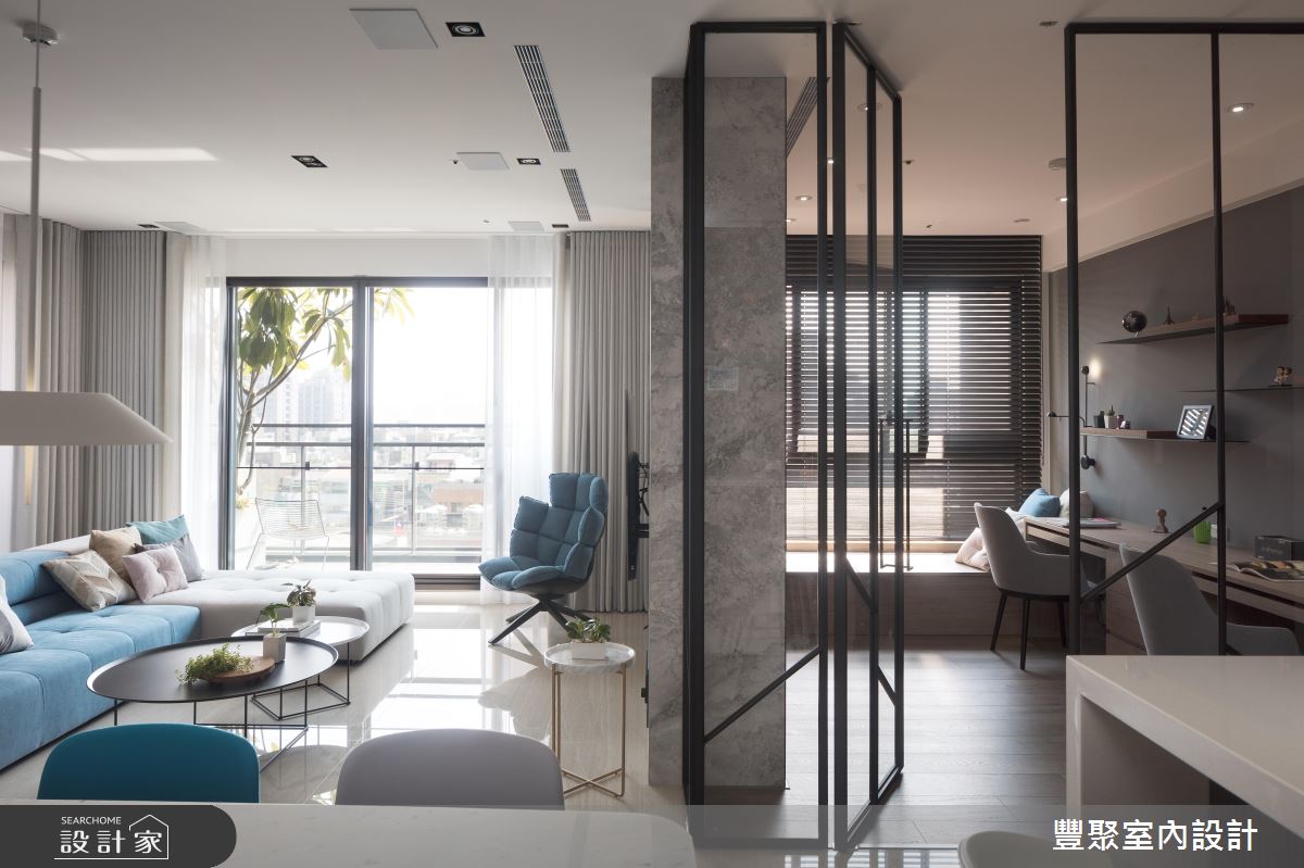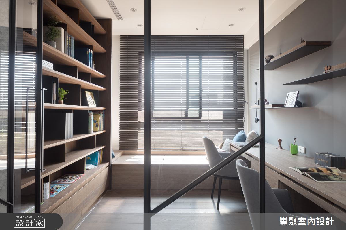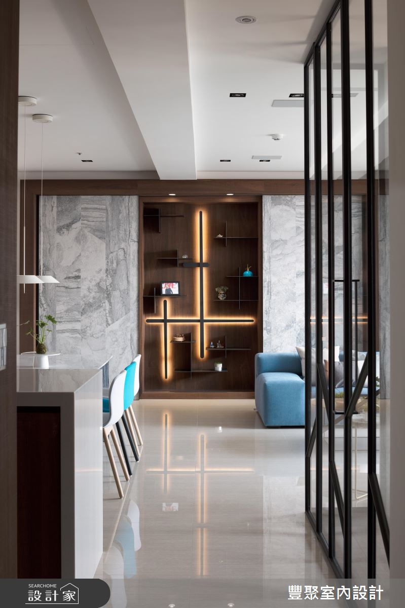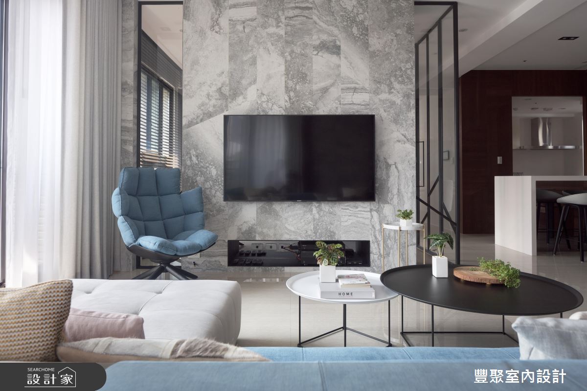 冬日暖陽從陽台引進室內,伴隨戶外的城市風光與綠意植栽,替家居生活挹注清新、自然的生命力,乘坐沙發上,愜意眺望遠方風景,心胸也隨之開闊。灰色、漸層紋路的石英石舖陳出電視牆造型,立面延伸至天花板,更添非凡器度;沙發後方的造型牆成為公領域的核心基準,兩側以石英石打造,中央利用層板搭建展示空間,以十字型交織立面造型,再搭配嵌燈設計,創造出新穎的視覺亮點,同時界定出客、餐廳領域;電視牆的側邊以玻璃、鐵件打造格屏,延伸至後方的書房,木作飾底的空間裡,藉由輕水模主體牆與木作層板搭建的書櫃,調和出自然樸實的閱讀環境,同時滿足屋主大量的書籍和收藏品的擺設需求,臨窗臥榻區更兼具休憩與閱讀姿態的轉換。