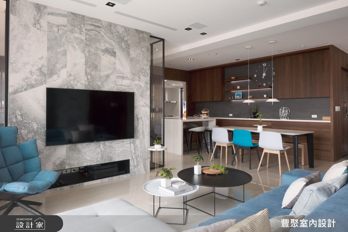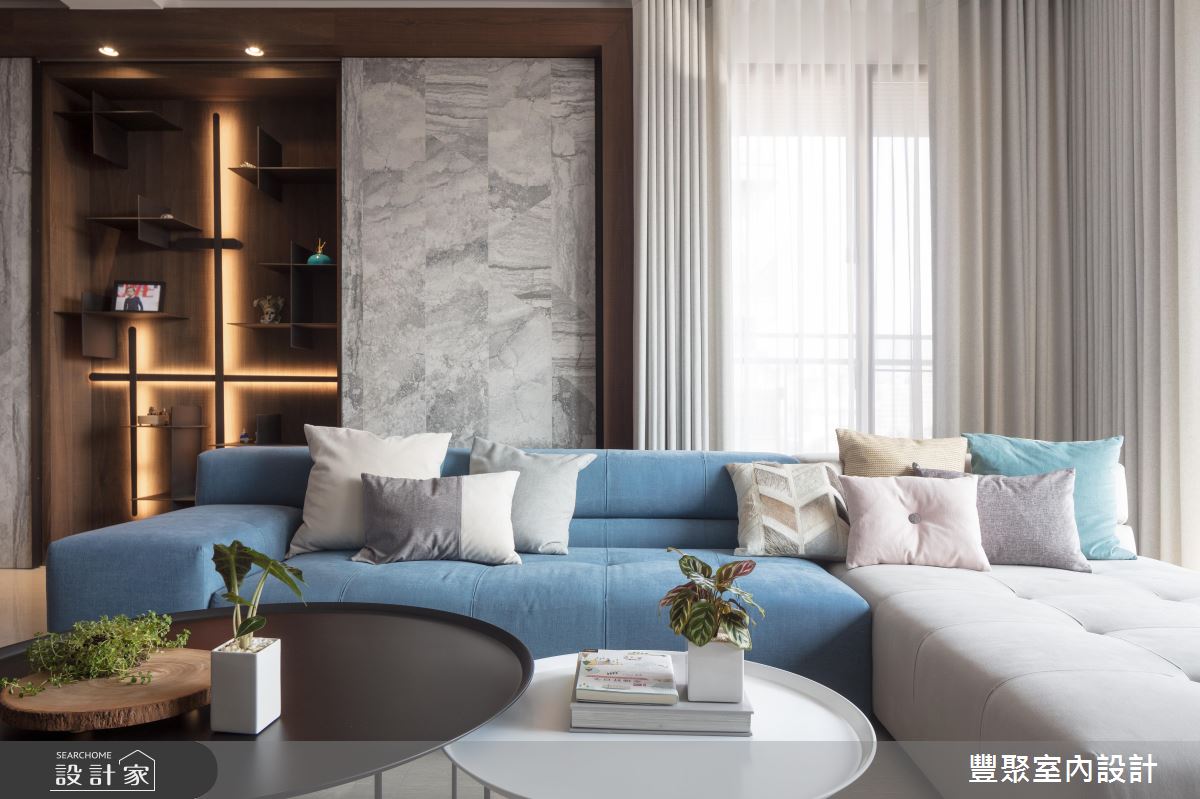 以淡雅的色系為基底,L型的絕佳採光面,醞釀一抹現代簡約的迷人風尚,沁藍成為空間裡最獨特的神采,畫龍點睛,且調和出舒壓、放鬆的家居氣息;沉穩大地色系則保留在餐桌領域,自然的原始質感與配色,替用餐氛圍增添溫暖情懷。