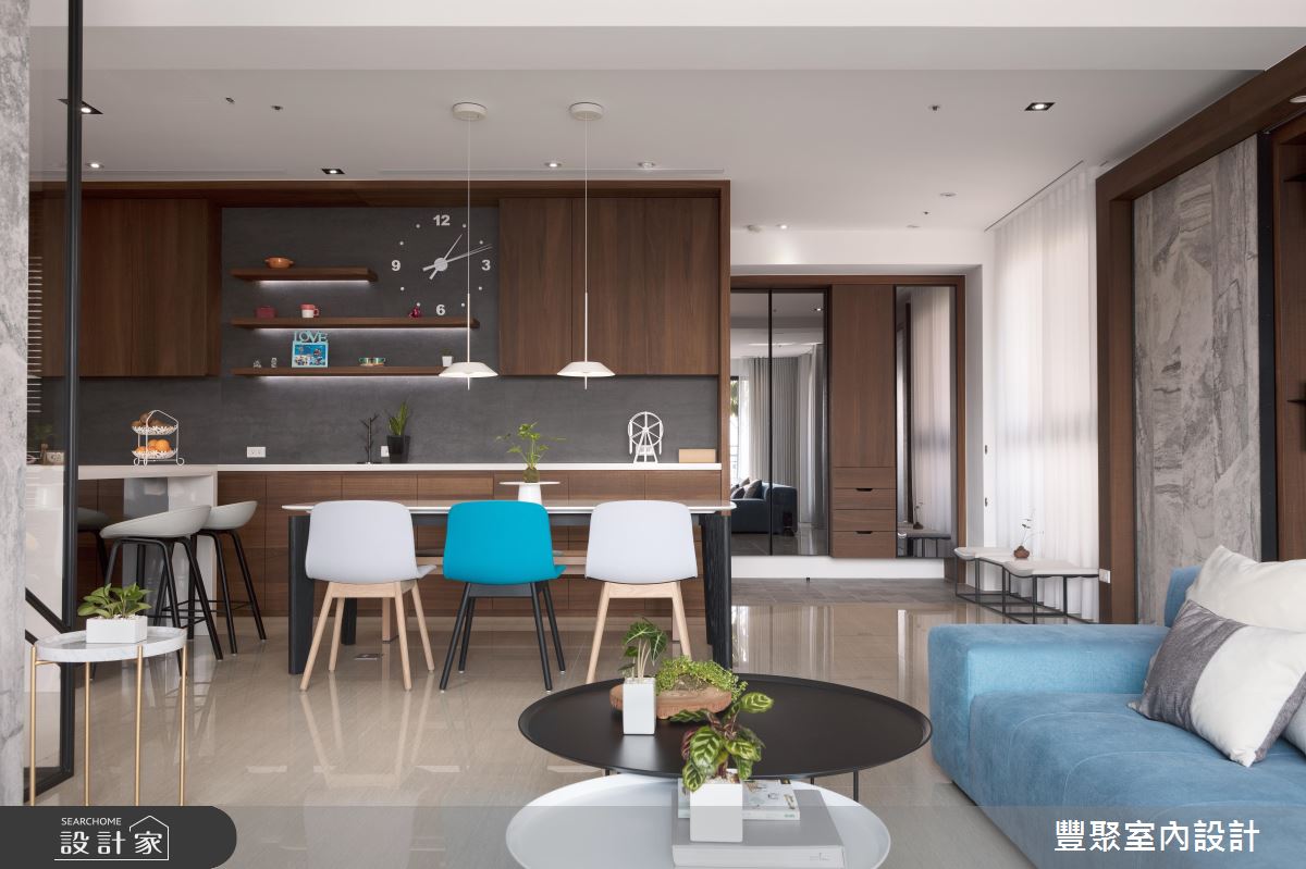 餐廚區植入深咖啡色系原木質感,注入溫潤、沉穩的氣息,與白色調的桌面、中島與平台形成強烈對比;餐櫃上方結合展示層板與時鐘,營造出活潑、生動的空間樣貌。
