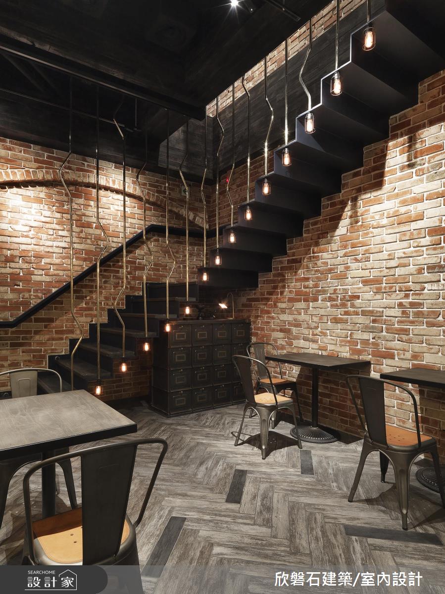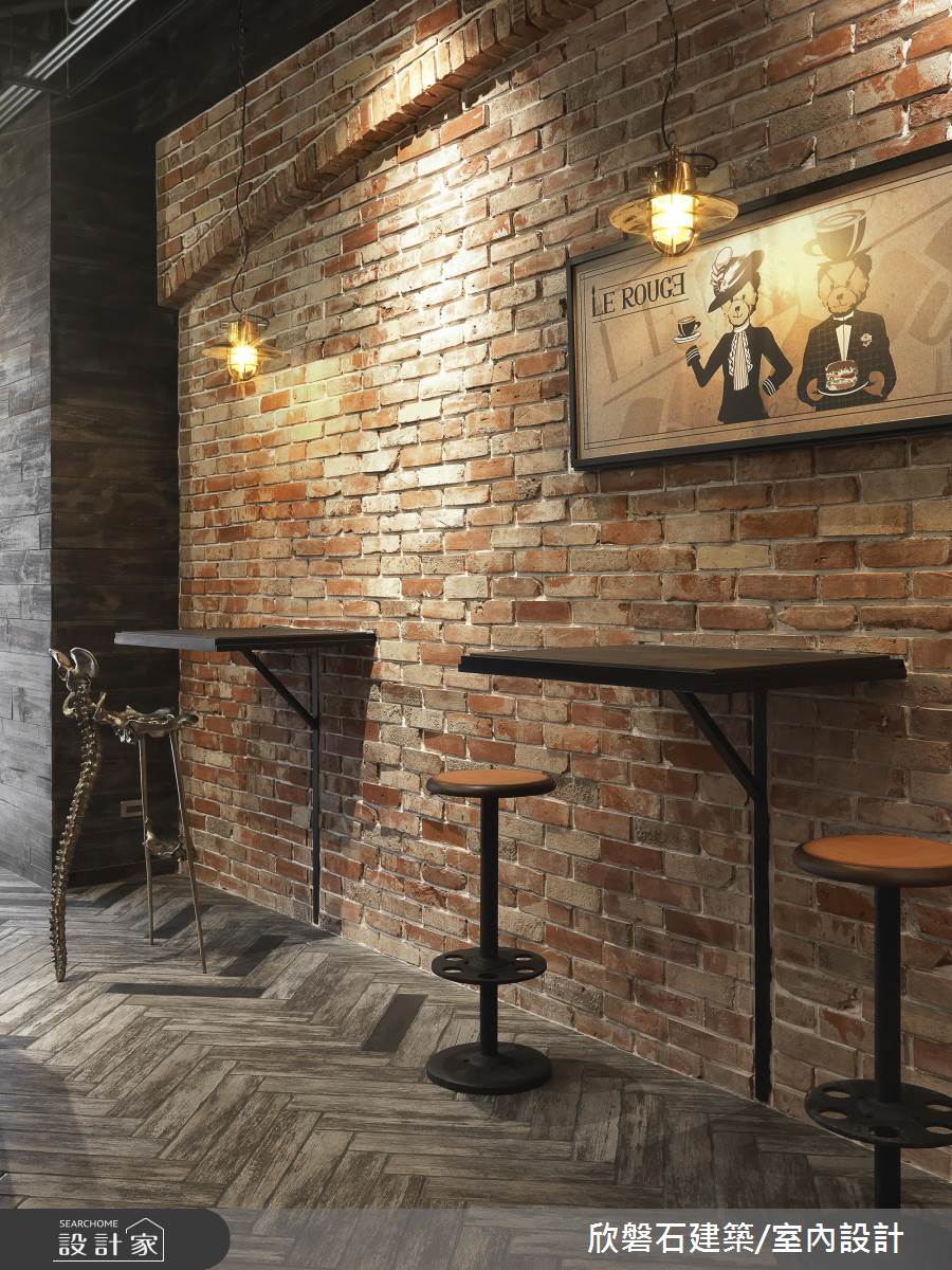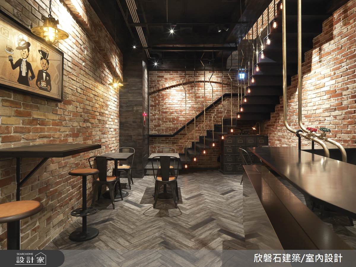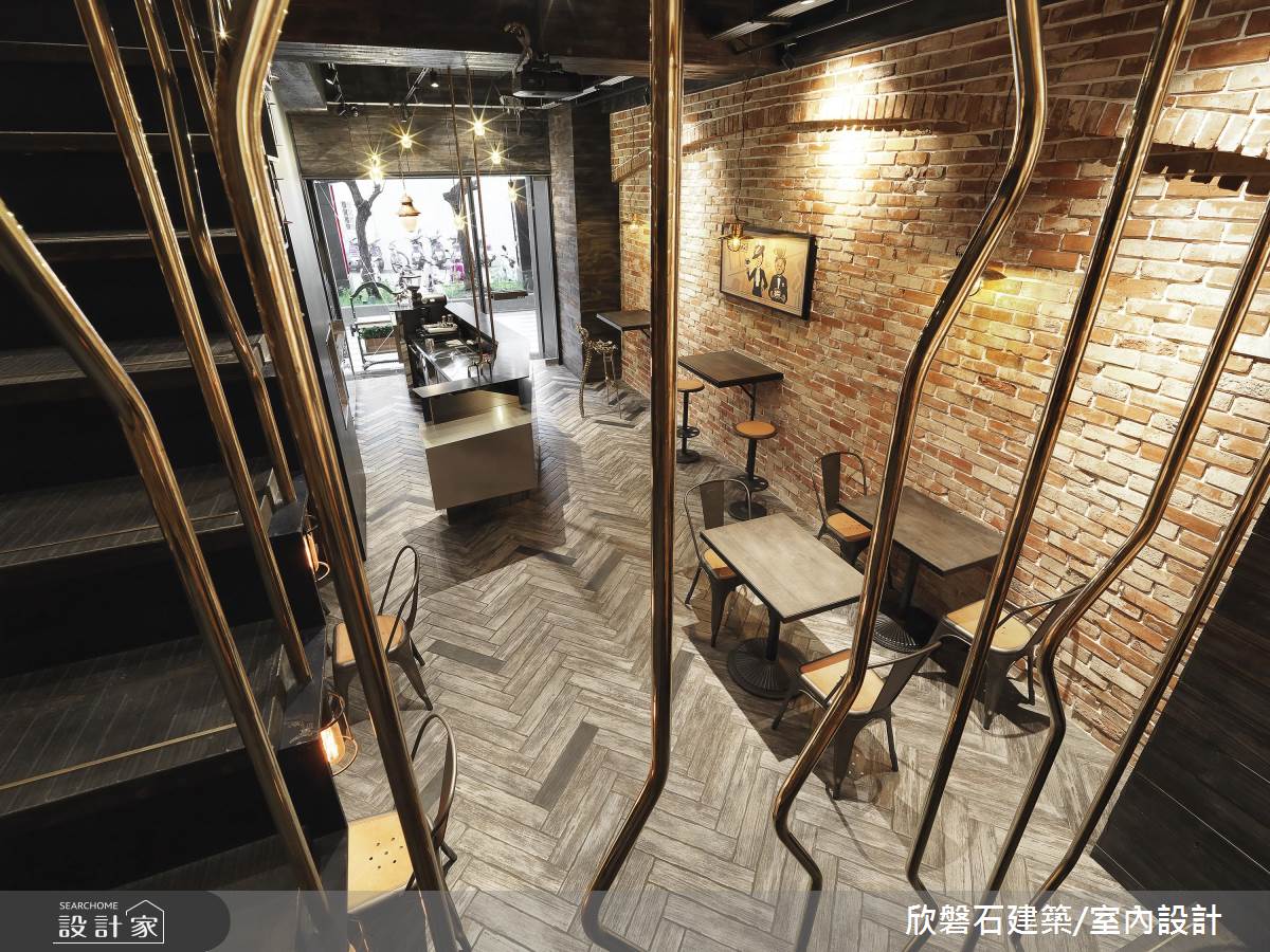 店內空間僅提供 16 個座位,以維持寬裕的行進動線, 1 、 2 樓皆採用進口紅磚打造粗獷不羈的視覺感受,並以造型黃銅欄杆串連樓層,挑高空間將天花與管線漆成黑色並收攏,鋪上人字拼地面,讓工業風格立現。吧台區域以不規則不鏽鋼底座加上鏡面檯面,搭配純手工打造、號稱咖啡界之神的 Speedster 咖啡機,創造前衛的時髦感受。業主對於單品的搭配極富品味,將蒐藏的各式藝術與古董展示於店內,包含入門處的黃銅高腳撒旦椅、百年歷史收銀機以及後方樓梯下的英國郵局信箱,營造了英式古典工業風格。