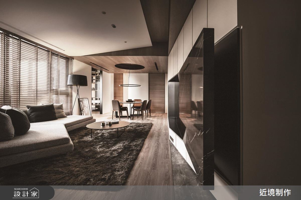 設計,起於平面,始於立面,終於天花;電視牆設計的起始發想,為用平面解構量體堆疊的概念,創造不同層次的立面設計,再藉由電視牆造型轉換消點視角,延伸至天花架構,成就空間中的天、地、壁、門、櫃,也完整室內建築的語彙。