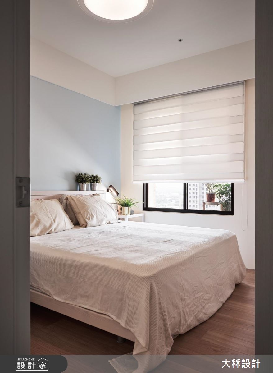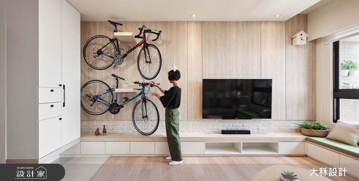 以休閒舒適感為主,設計師運用大幅的淺木色、純白,打造出清新無印的感受,設計師拆除了一間房間,改為書房以及儲藏室,並增加廚房吧檯,延伸原有廚具,新增洗碗機等設備的空間,桌邊也能收納屋主的馬克杯收藏,挹注齊備的生活機能性,加上清透的玻璃隔間,讓公領域更具穿透明亮感,帶來放大空間效果。另外,因為腳踏車收納於室內,為了讓空間更好整理,設計師減少了文化石的面積,以好整理的美耐板達到屋主的期望。臥室以簡約明亮為主,床頭繪上清爽的淺天藍,搭配柔軟舒適的床組,營造輕鬆休閒的私領域氛圍。