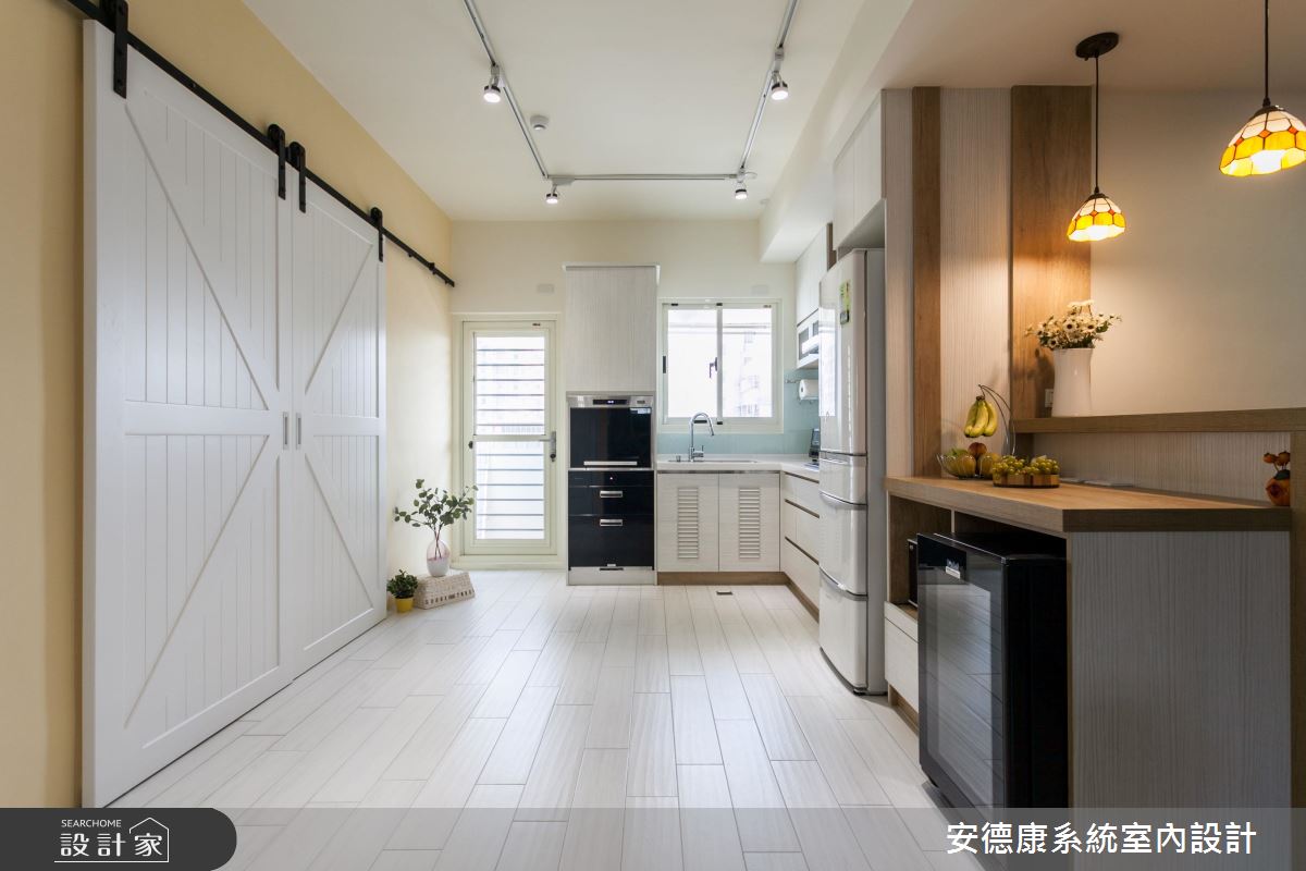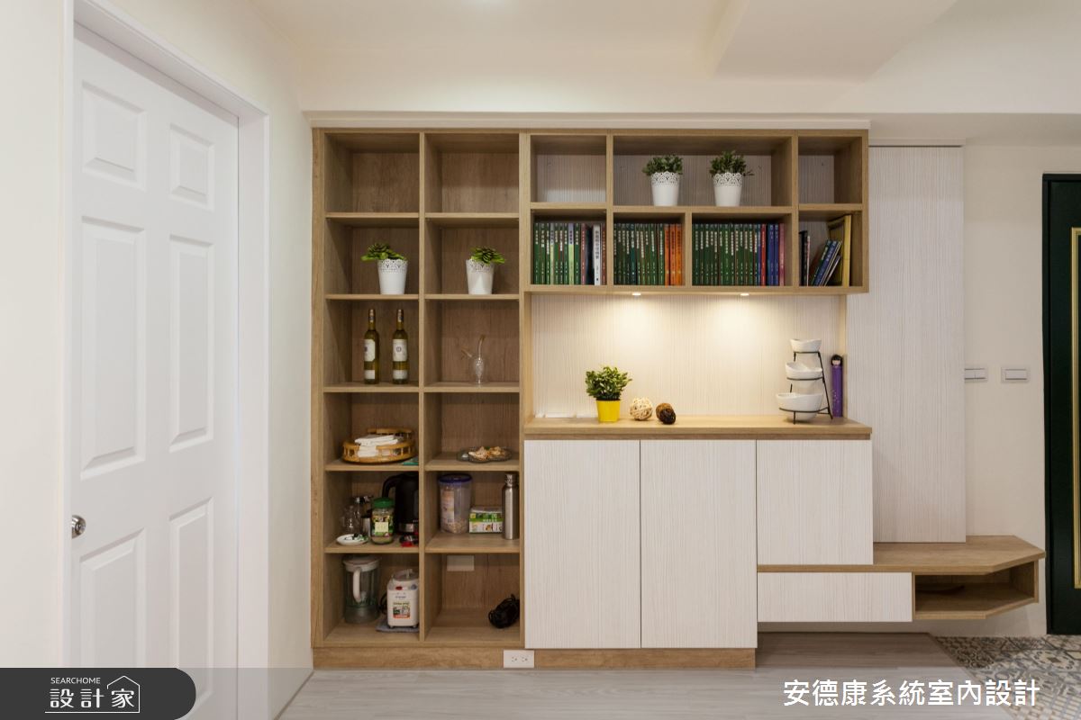開放式的居家空間,以簡約舒適感的北歐、無印風格為主,運用大量的木質和純白色調,營造清新溫潤的印象感受。玄關處運用花磚和收納櫃,打造出實用且美觀的第一印象,室內廳區以溫潤的木地板接續,轉至廚房則改用耐用、耐水的木紋磚,屋主平時也能更容易整理。因餐廚區原有另一臥室的出入口,造成動線和家具家電安排的不便,另外也有臥室內床頭緊鄰浴室的問題,因此設計師針對原有格局動線進行修改,並以系統櫃隔出了小型的更衣間,擴大的臥室坪數,也能融入閱讀、多功能區,挹注多元的私領域機能性。