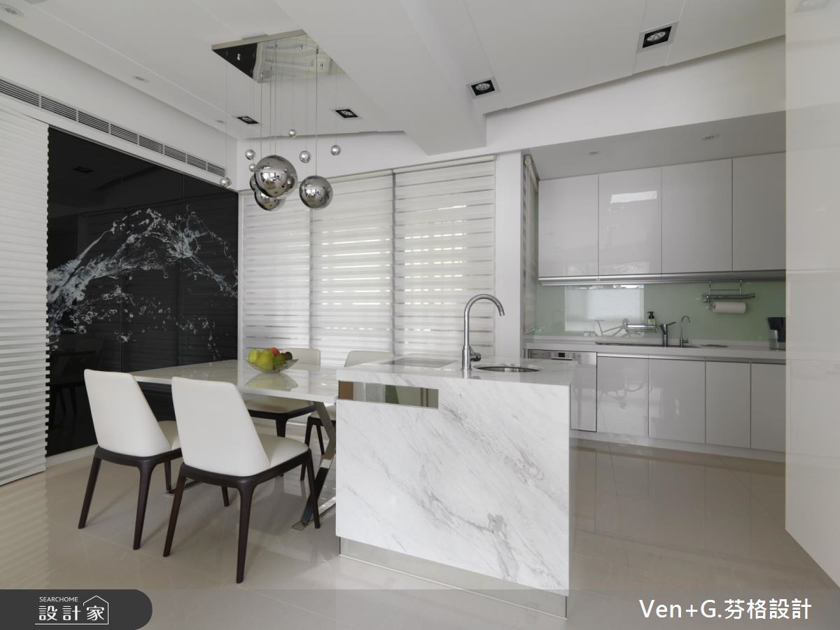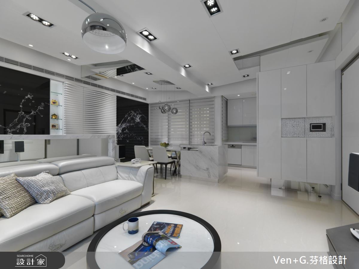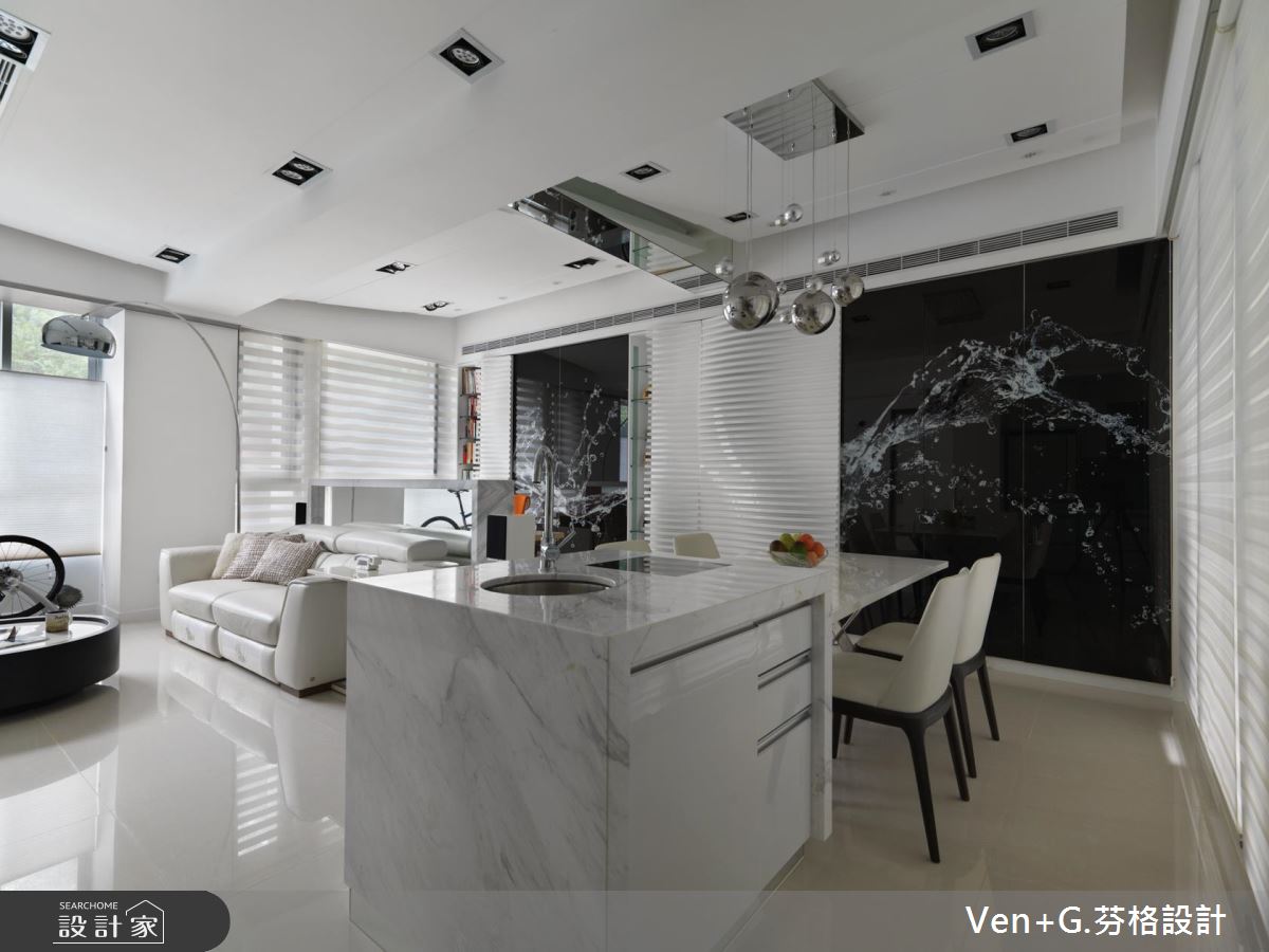 在設計師的靈感筆觸之下,將抽象的水境變化成實體設計,藉由材質的紋理或以創意手法營造,捕捉出稍縱即逝、或靜或動的水態,讓使用者可感染到空間的自在情意,相互交融且不受拘束;同時引入親子共享的開放場域規劃,將原無隔間的新成毛坯屋重新規劃,使客廳與開放式書房連通,僅以白色大理石作為小型隔屏,再巧用鏡面創造通透效果,營造更為寬闊延伸的公區視野,同時加入印刷玻璃門片,使動態的水紋影像瞬間凝聚於空間之中,展演出律動的軌跡;客廳另一側的餐廚區域,則配置中島吧檯,串聯成半開放式廚房領域,讓親子的生活互動更為緊密,也成就宴客活動場域,活絡起家人或主客間的情誼!