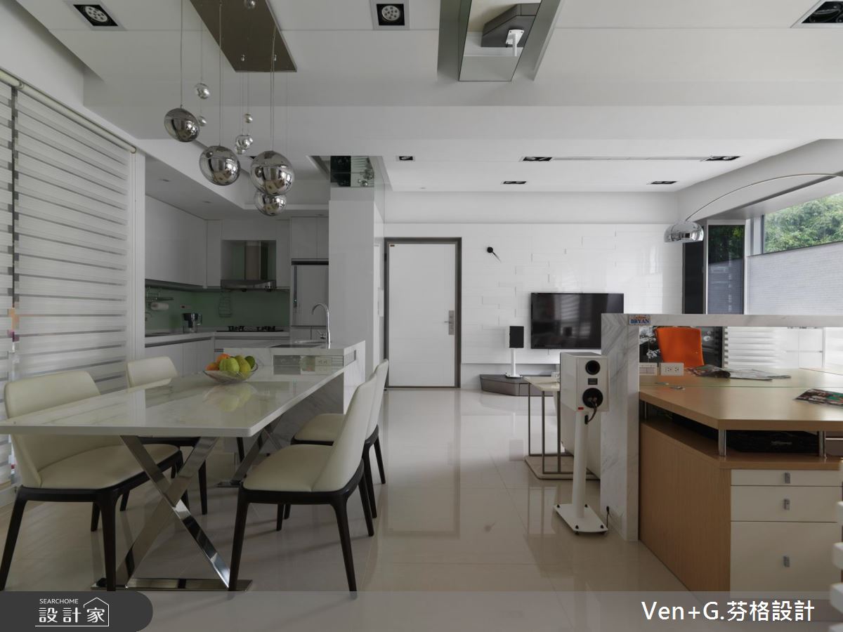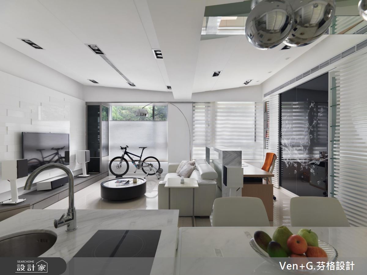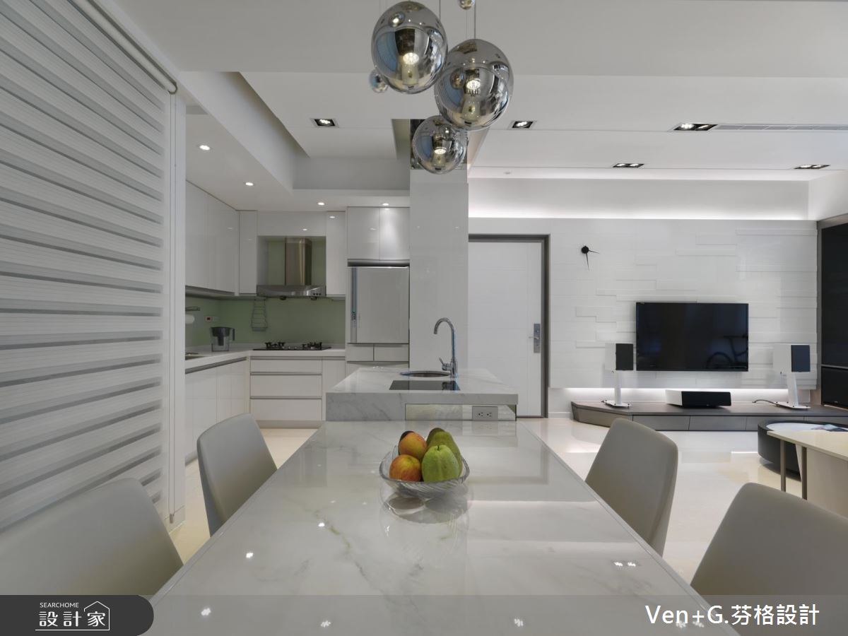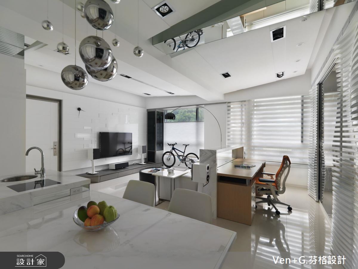 在設計師的靈感筆觸之下,將抽象的水境變化成實體設計,藉由材質的紋理或以創意手法營造,捕捉出稍縱即逝、或靜或動的水態,讓使用者可感染到空間的自在情意,相互交融且不受拘束;同時引入親子共享的開放場域規劃,將原無隔間的新成毛坯屋重新規劃,使客廳與開放式書房連通,僅以白色大理石作為小型隔屏,再巧用鏡面創造通透效果,營造更為寬闊延伸的公區視野,同時加入印刷玻璃門片,使動態的水紋影像瞬間凝聚於空間之中,展演出律動的軌跡;客廳另一側的餐廚區域,則配置中島吧檯,串聯成半開放式廚房領域,讓親子的生活互動更為緊密,也成就宴客活動場域,活絡起家人或主客間的情誼!