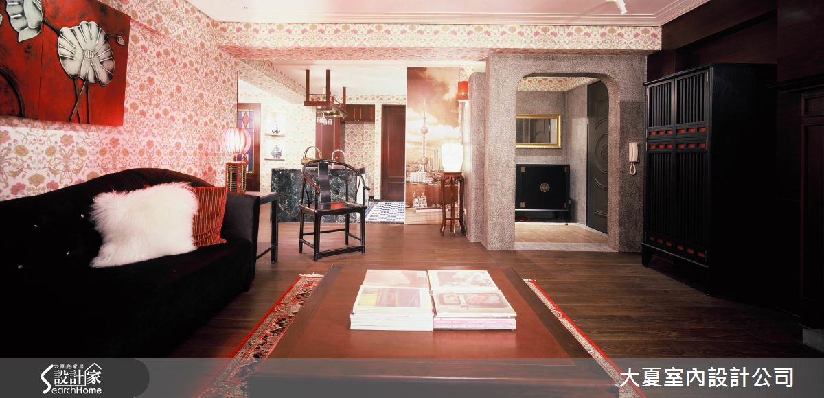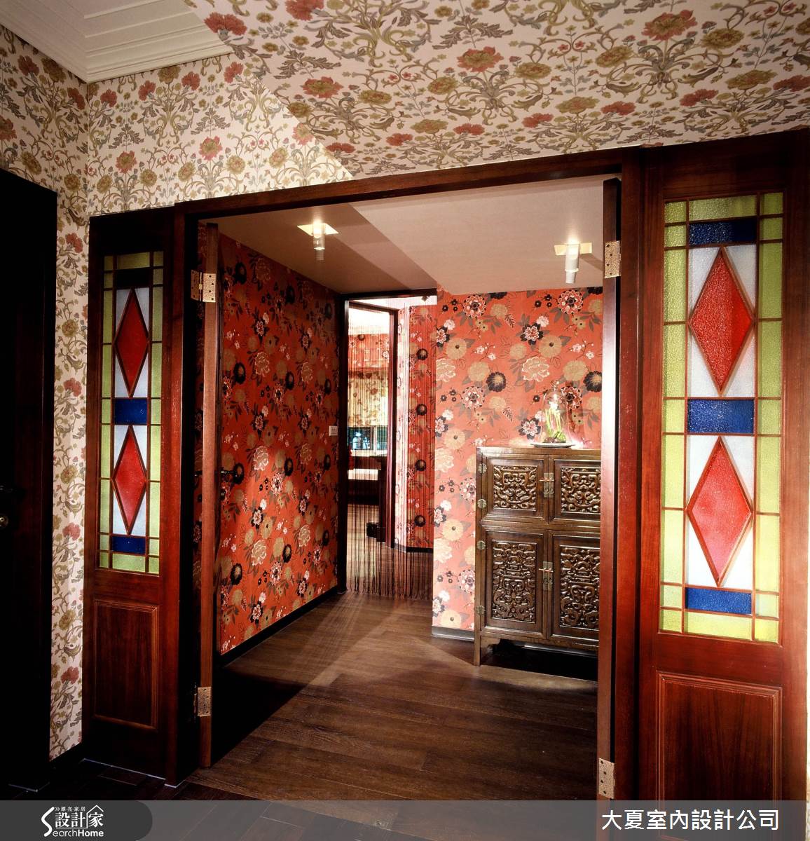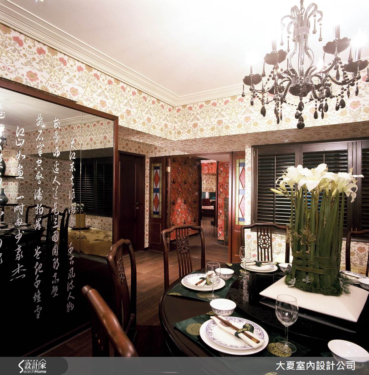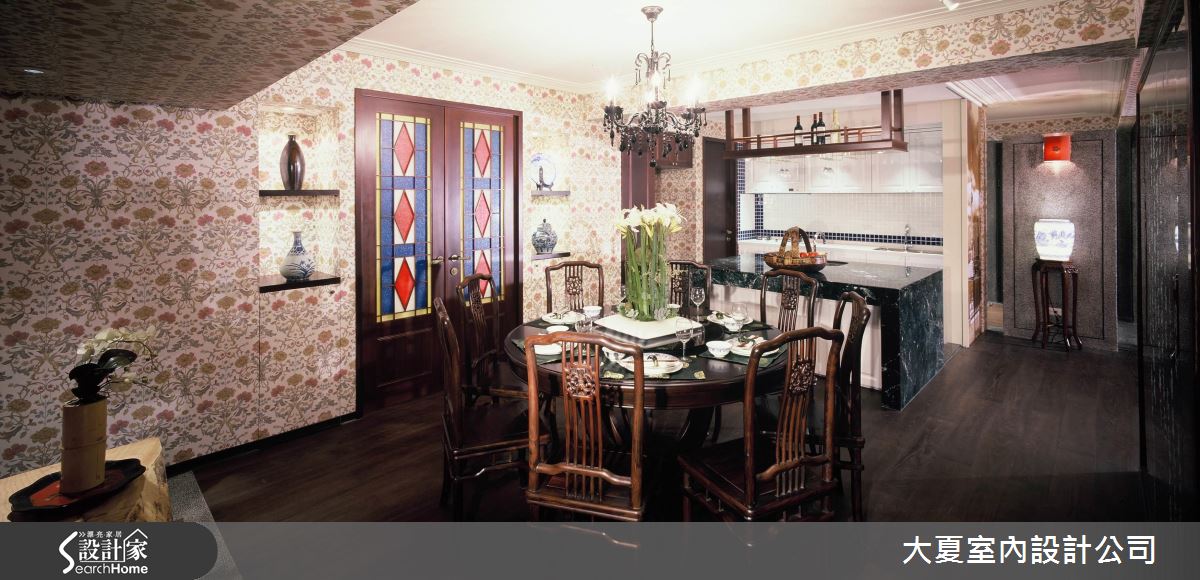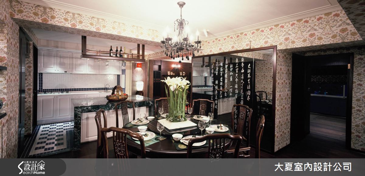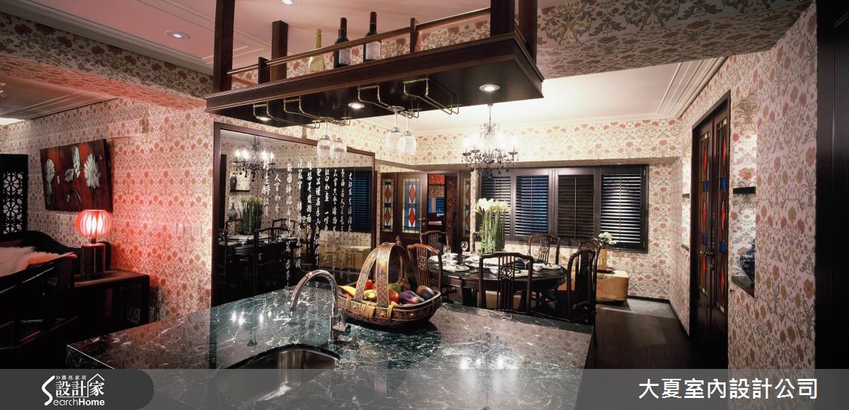 深色的木紋地板鋪敘一室,帶來安定、沉穩的空間氣息,原木家具以及局部黑色櫃體的擺設,引出中式的復古情懷;團花壁紙遊走在牆面與天花板,紅色印花視覺洋溢著東方獨特的熱情與喜氣,餐廳的天花板以華麗感的水晶吊燈擺設,一旁為大理石打造的中島,挹注些許華麗色彩,豐富的質感與色彩喚起老上海居宅的記憶,重現歷史的懷舊與美好文化。