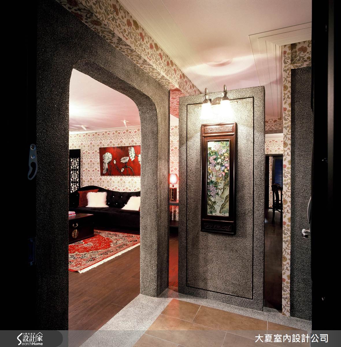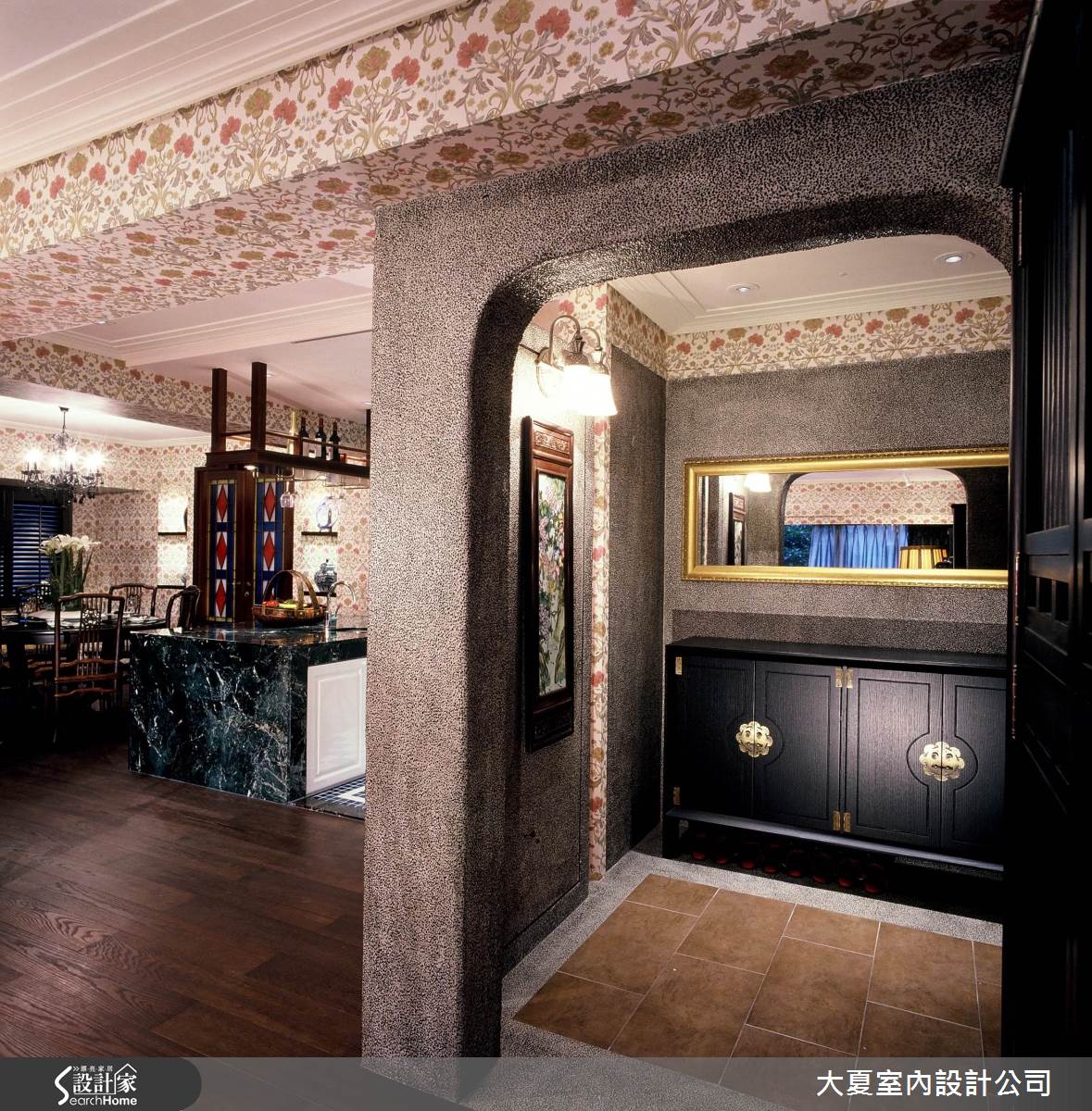 圓角拱門圍塑出玄關,以抿石子舖陳壁面,土黃色的地磚化作落塵地坪,形塑內斂、溫暖的迎賓感受,前方搭佐一幅中式畫作的微型屏風,些微穿透的視覺感,創造漸層的領域變化;壁面擺設黑色復古的鞋櫃,上方懸掛長形鏡面,金屬邊框與細節手把的點綴,挹注些許華麗質感。電視主題牆以胡桃木肌理打造,一展貴族氣息,兩側擺設黑色復古櫃體,流露一股優雅氣質,內部收納著音響設備,兼具美感與機能;電視牆的中央,藉由加高的古典壁爐為造型,呼應英式殖民風情;餐廳空間裡擺放中式圓桌與竹節椅,營造古色古香的懷舊氛圍,一旁為西式中島餐廚區,義大利綠的大理石檯面搭配滿點的收納機能,展現俐落的現代風尚。
