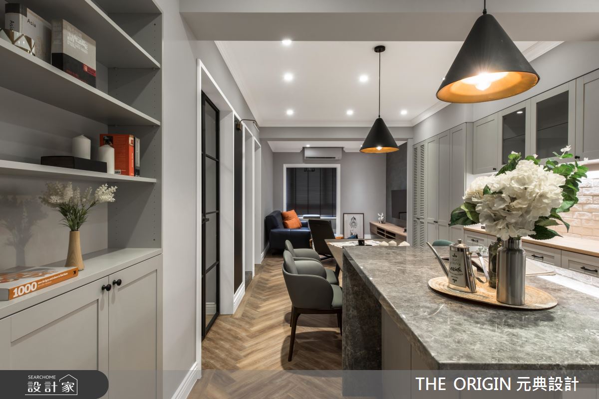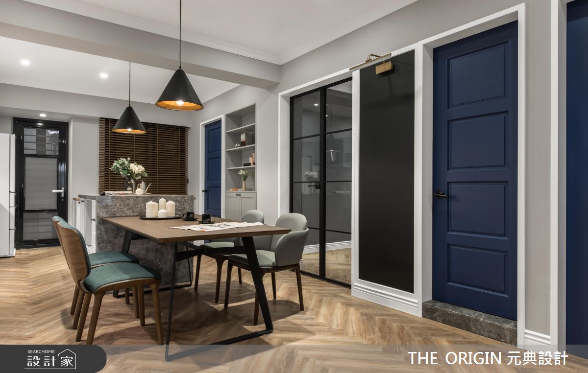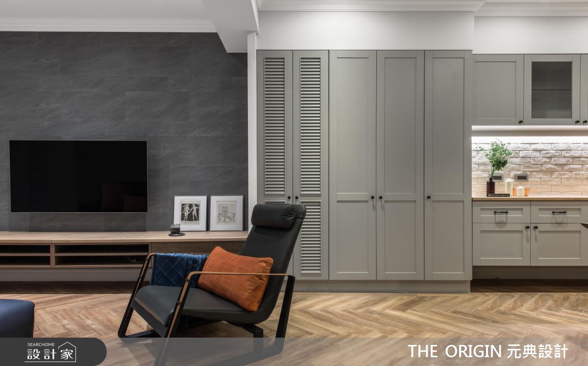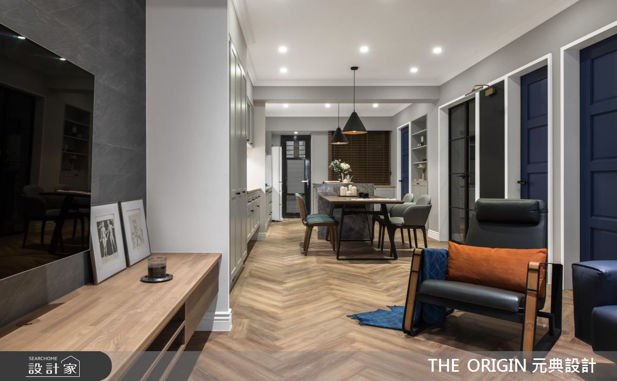 甫入門,即可見玄關拼貼復古地磚,同時安置一座白色百葉鞋櫃,凝聚略帶鄉村的質樸況味,搭配穿鞋椅兼臥榻的設計,讓入口印象顯得閒適而放鬆;空間內,則利用人字拼木地板串聯全室,在灰色、深藍等地鋪敘之下,凝聚自然休閒之感,並妝點文化石花磚等特色壁材,散播高雅的異國氣質,同時整合立面,讓電視牆、餐櫃、廚具設備等一路銜接,其間安置展示空間,帶出整道牆面的趣味層次,而另一側牆面則統整門片表情,在藍色的揮灑之中,型塑優雅的一致性;同時在有限的空間,加入開放式餐廚規劃,打造出實用延伸中島平檯,一來整合機能讓使用更具彈性,二來也能作為視野上的開放延伸;書房與寢臥則個別加入淺灰藍色,運用白色的櫃面與簡約線板勾邊,展現細緻從容的居室氛圍!