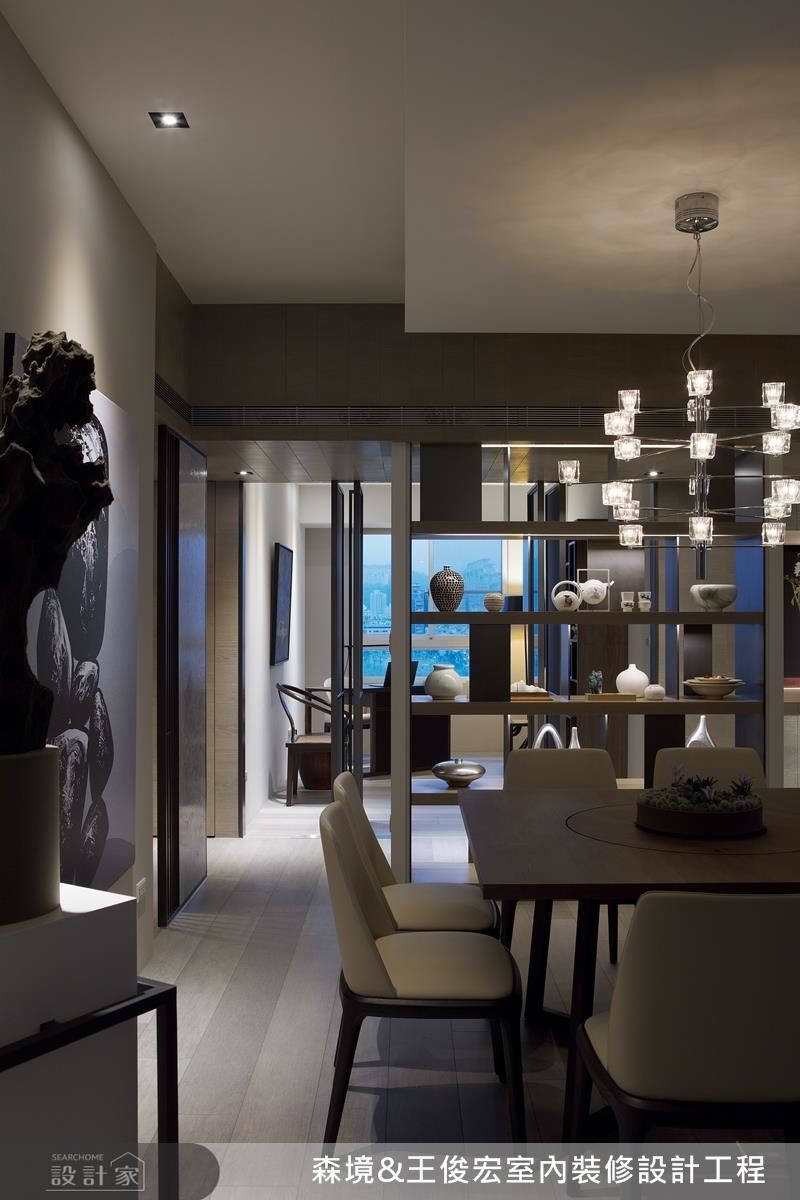 空間格局的安排,為了滿足私領域的隱私,將公共區的客、餐廳以電視牆及餐桌旁虛實交錯,具穿透感的端景櫃,界定廊道空間,使得進出房間不會與公共區訪客相互干擾,保有充分的隱私。尤其餐桌旁穿透的隔間櫃,與書房刻意採地鉸鏈設計的門片搭配,達到充分引光的效果。噴砂玻璃門片材質,則讓書房兼具客房的隱私效果。
