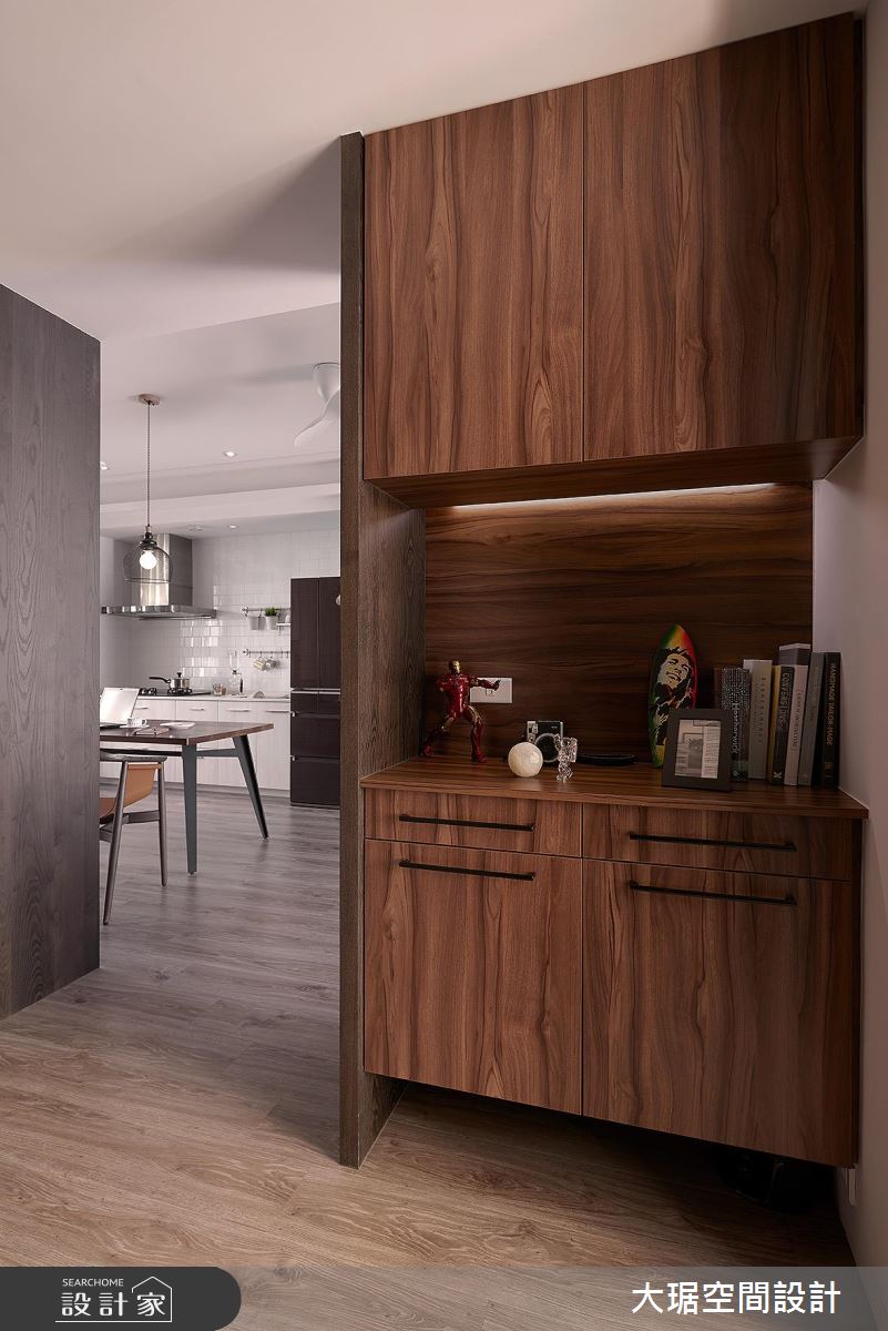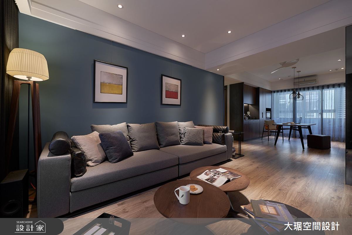 玄關入口處,以懸空的木作鞋櫃擺設,醞釀自然無華的生活態度;公領域裡,簡約的天花板結合嵌燈照明,隨時能調和出低調、暖心的居家氣息;客廳裡,用最簡單的壁面展現電視牆機能,灰色質感沙發結合圓形木紋茶几,搭配一盞長型立燈,流露靜謐、優雅的現代感居家情鏡;利用藍色調創造主體牆,再搭佐兩幅水彩畫作,獨特的藝術用色展現屋主內在的人文特質;餐廚區全然開放領域,乾淨無暇的純白流理臺,一旁以灰鏡打造大面積的收納櫃,替沉穩、內斂的空間氛圍注入明亮光采,提升空間整體的明亮度;原木餐桌與後方深色調木作收納櫃,營造舒心、療癒的用餐氛圍,讓人愛上家的味道。