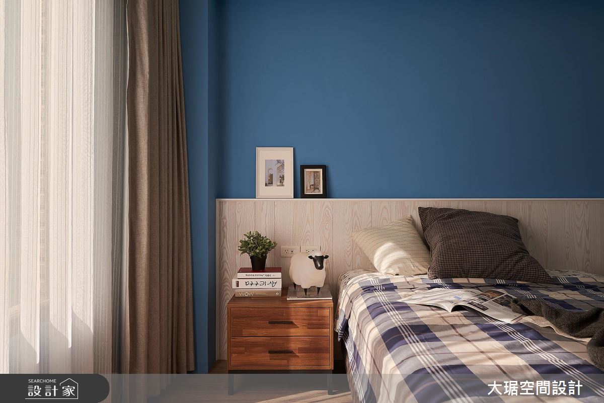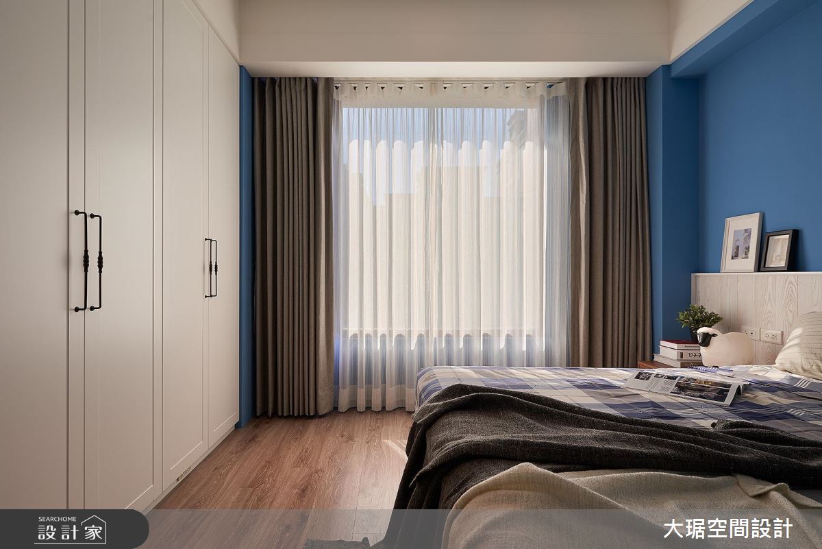 主臥室裡,延伸客廳背牆的藍色調,成為整個床頭壁面的主視覺,搭配淺色木紋堆疊的壁面以及衣櫃,調合清爽、舒適的休憩氛圍。