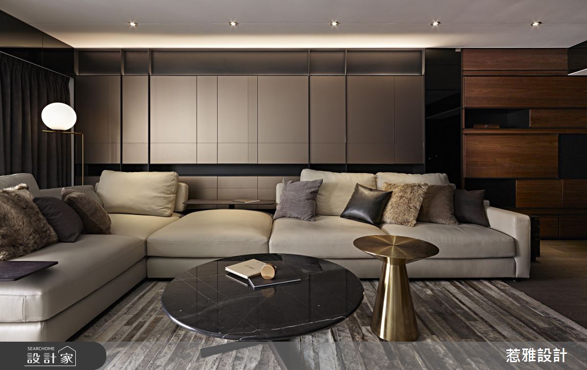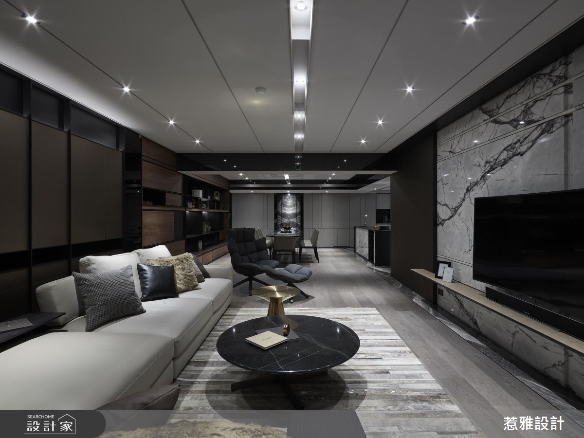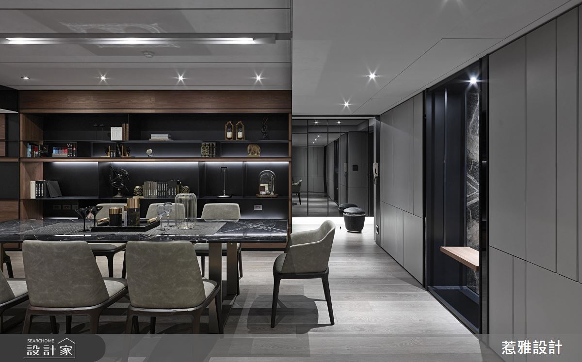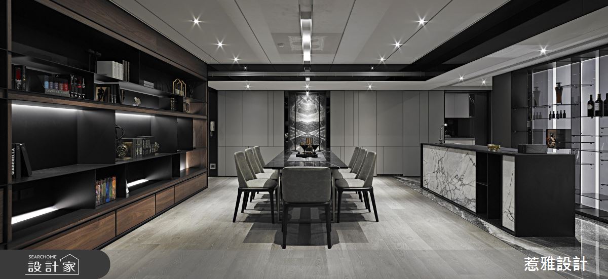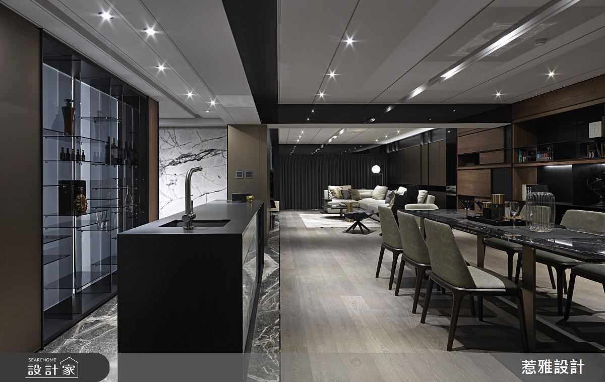 設計師為了做出較大幅寬與長軸空間感,運用大量的鐵件造型櫃體以及門片造型修飾,來混淆原本偌大笨重的柱體存在,藉由塊體與開放格櫃,展現跳躍視覺感,同時也增加收納展示機能,針對低矮天花與大樑,則使用黑色鏡面來作修飾,框出不同的場域範圍;空間亦選用紐約石材,彰顯強烈獨特的藝術紋路,串聯整體的一致格調;視覺可見的所有立面,都刻意加入長軸線佈局,像是讓餐廳餐櫃串聯沙發背櫃,形成更為延展的空間感與層次變化; 且讓客廳、餐廳與吧檯區域彼此穿透,促使互動更為緊密,地坪材質也給予多樣化選材,區劃出每個場域的各自屬性!