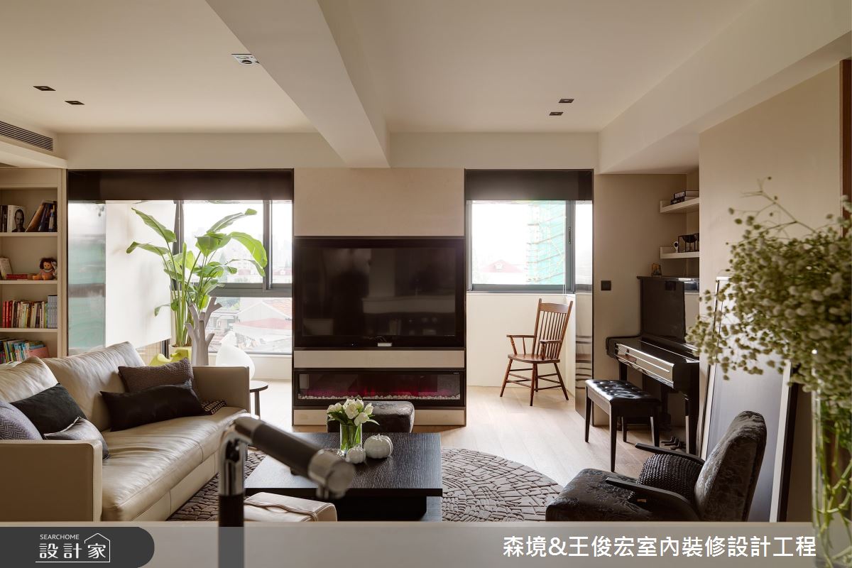 設計師顛覆傳統看電視的習慣,選擇將大型液晶電視懸掛在兩個ㄇ字開口中間,而這兩道開口,原是兩扇落地門窗,透過拿掉門框處理後,不僅讓光線穿透入室,空間也隨之放大,壓迫感亦消弭於無形,且加入進退有據的空間配置手法,讓開放的客廳兼具書房、客房機能,一旁亦讓鋼琴巧妙嵌合牆體,使空間可充分被利用;封閉的廚房則將之打開,除了保留結構安全柱體之外,更結合開放的鐵件層架,創造出輕食吧檯及書報展示架的複合機能,讓餐廚區與客廳串聯,使公共區變得更開闊!
