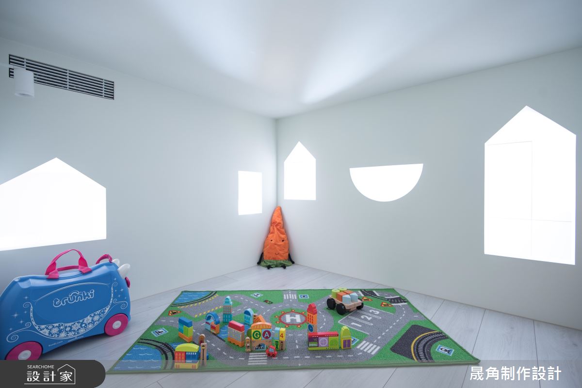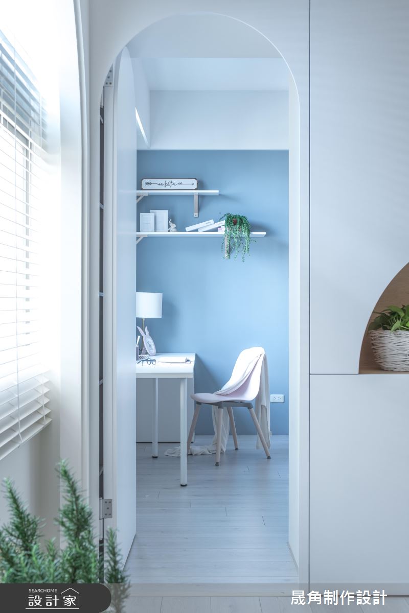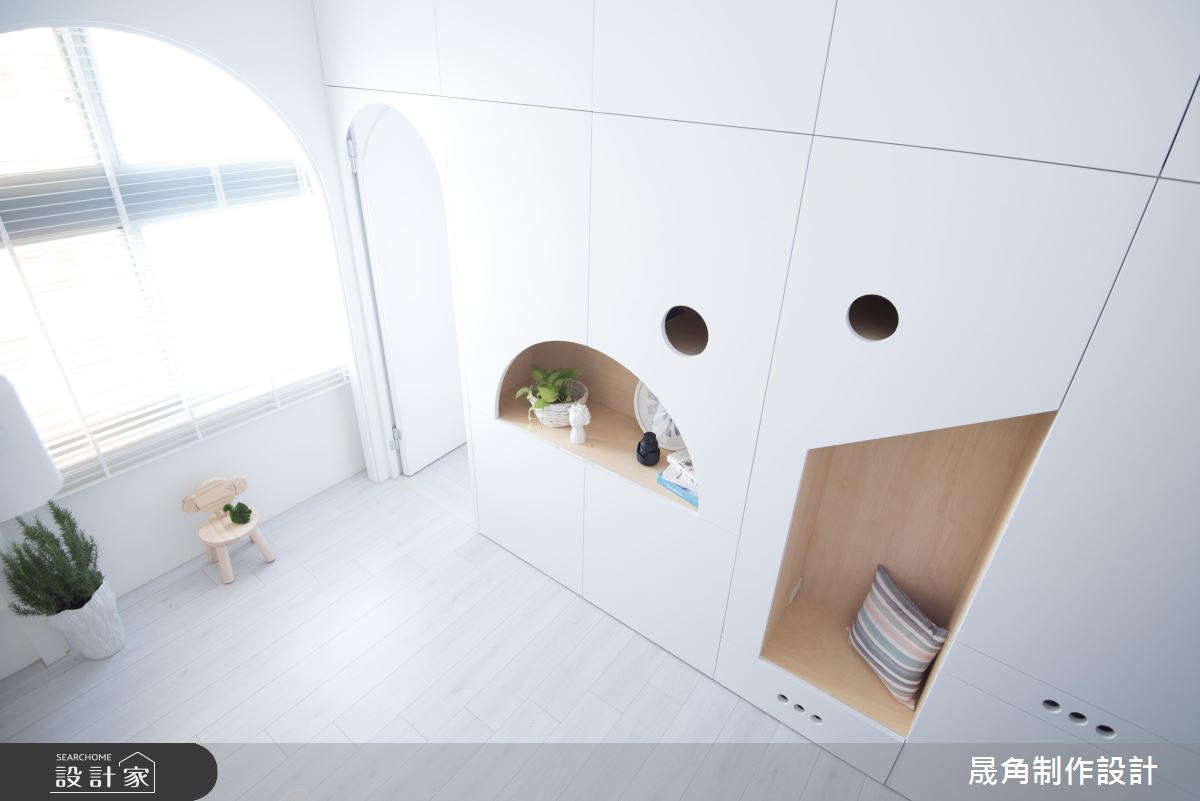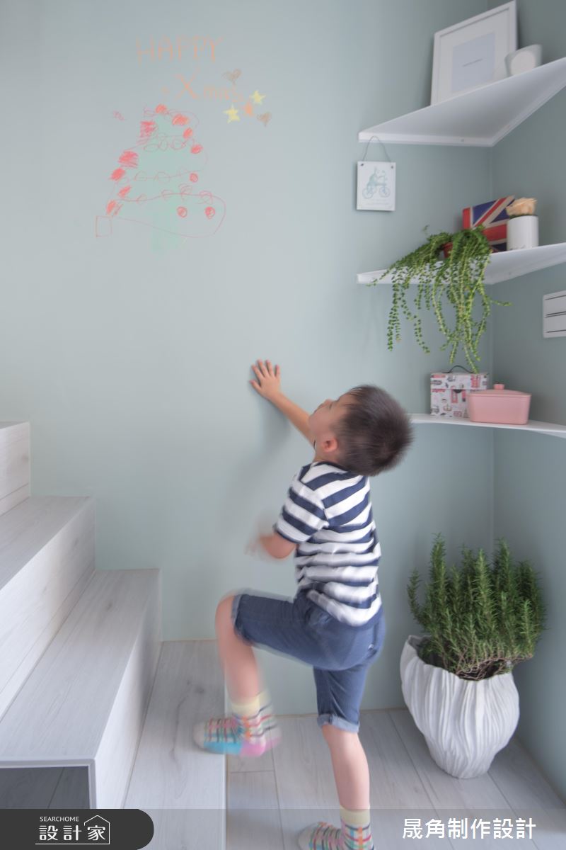 取代客廳,設計師以中島餐桌做為家的互動中心,父母親可以隨時環顧四周,照看到孩子的活動。以輕薄造型製作的樓梯,善用下方開放區域,增加冰箱家電的收納,搭配系統櫃,讓女主人的鍋具收藏也有了充足的儲物區。整面的收納櫃不僅具收納功能,更特別加入淺木色的幾何圖形鏤空,成為孩子最愛的遊戲區。窗戶和門框則以圓拱造型相互呼應,成為充滿活潑童趣的獨特亮點,加上百葉窗設計,更富有北歐風情。考量到孩子的健康,特別選擇無甲醛乳膠漆,通往小閣樓的梯階旁則加入了黑板漆,讓孩子的創意可以盡情揮灑,主臥室則以沉穩的灰藍色為主調,搭配簡約床具、桌椅,營造舒眠沉靜的空間氛圍。