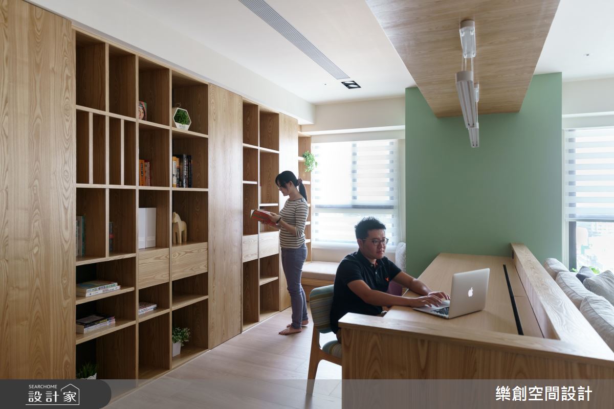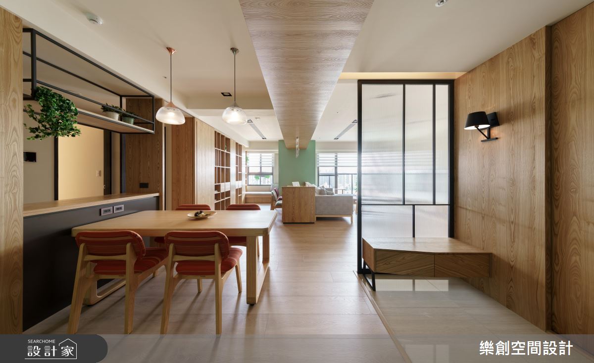 設計師讓客廳、書房、餐廳採開放規劃,搭佐著大面積採光優勢,以及滿盈室內的溫潤木質感,營造舒適無限的自然氛圍,玄關處則配置輕盈的玻璃屏風,適度緩解穿堂煞疑慮,並讓光線得以照亮入口區域;書房空間規劃一整面書牆,成為了居宅內的視覺主題,採用色調輕淺的木質型構開放收納櫃,在錯落有致的展示格櫃之間,交織出圖書館般的溫雅氛圍,且刻意讓書桌平檯以矮牆型式存在,讓使用者可隨時與周邊交流,打造親密自在的互動時光;餐廳區則與廚房呈半開放關係,透過隔間矮牆的設計,讓餐廳多了備餐檯機能,且同時具備早餐檯與輕食吧檯主題,充滿著北歐風無私分享的生活理念!